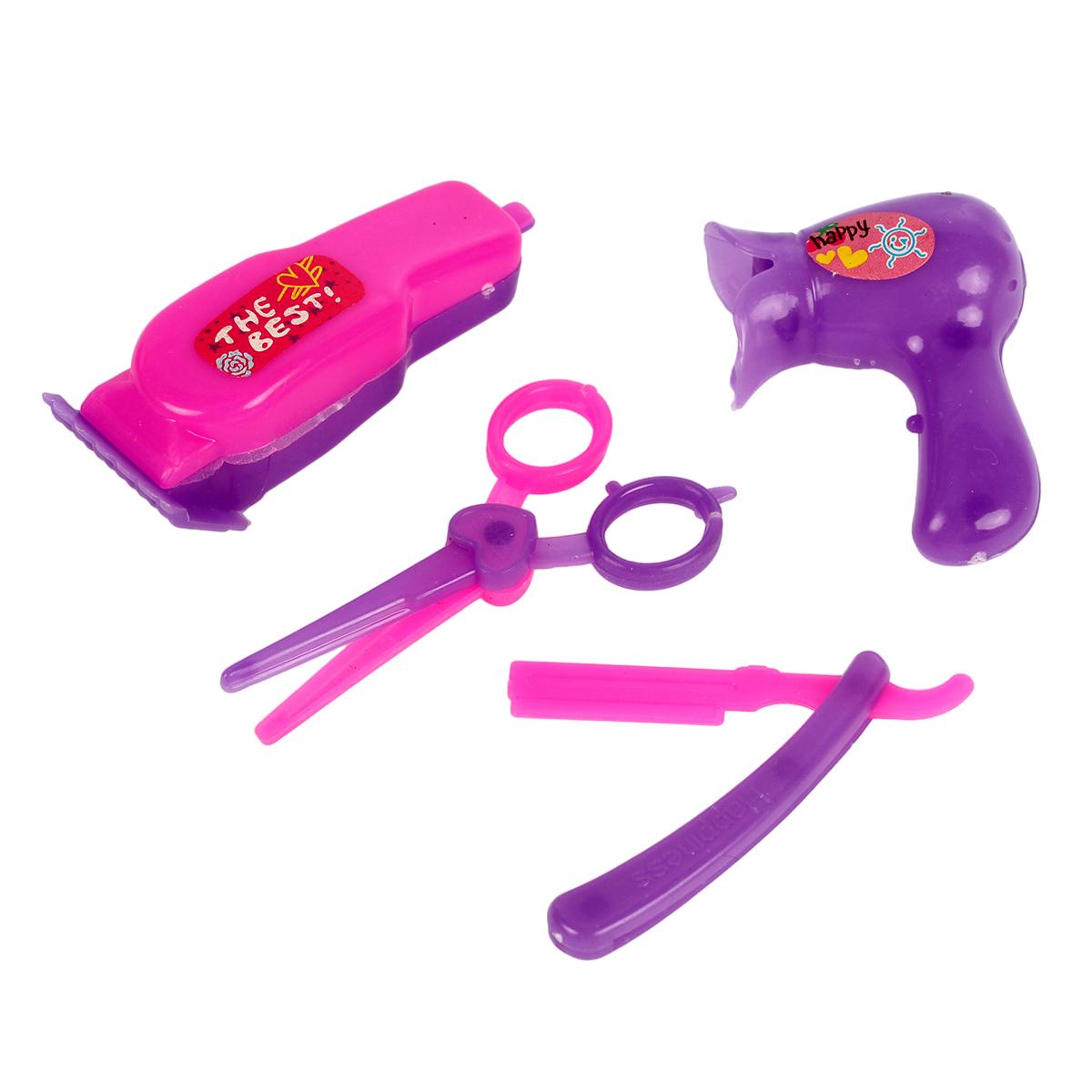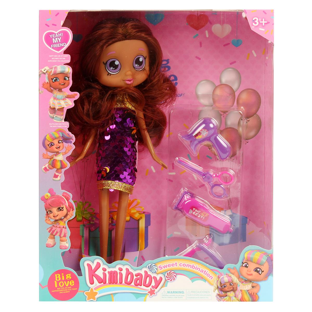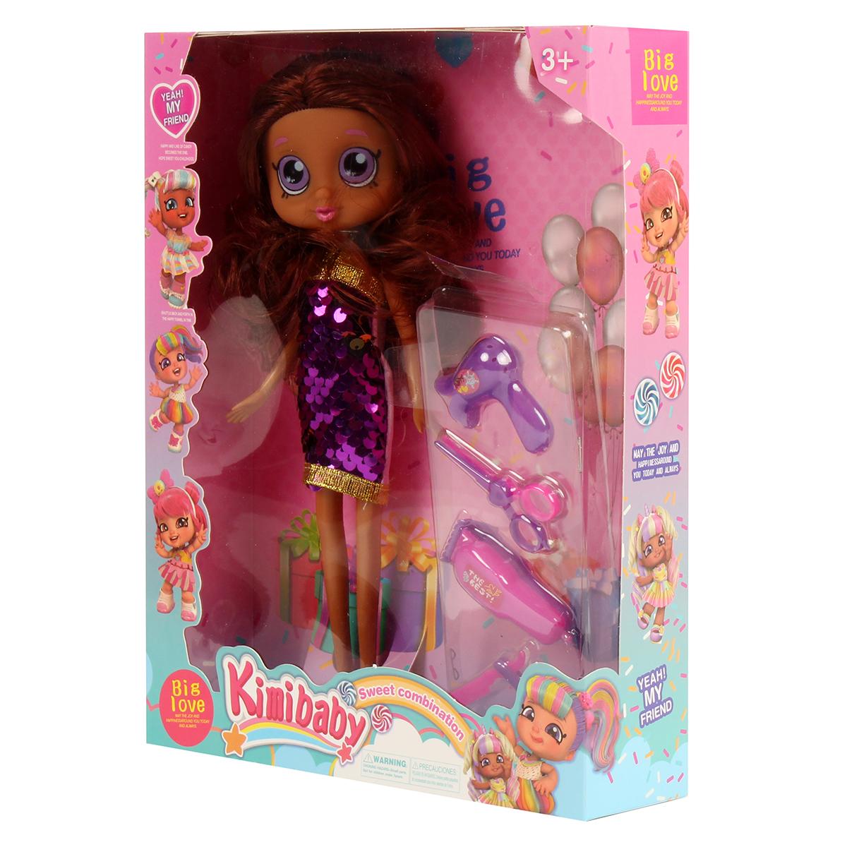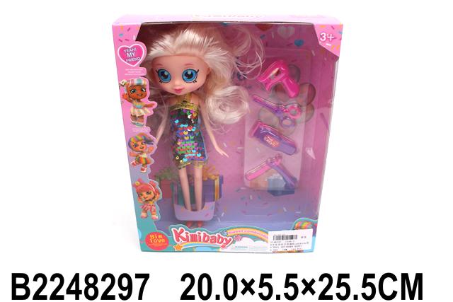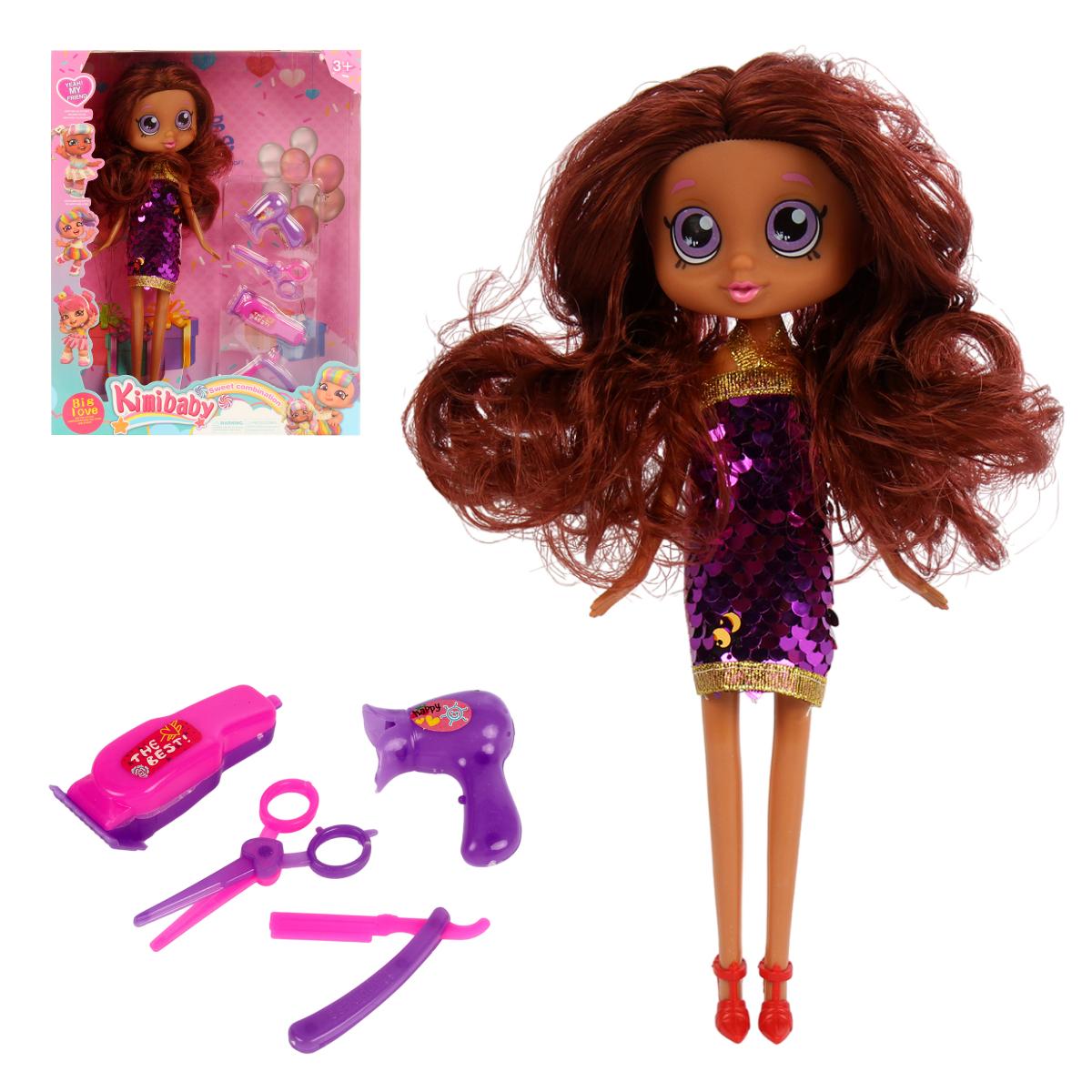 Размер упаковки: 20,0 × 5,5 × 25,5 см. В комплект входит 1 кукла в наряде и аксессуары для игры — расческа, ножницы, фен, игрушечная машинка и другие элементы. Материалы соответствуют стандартам безопасности для детских игрушек.
