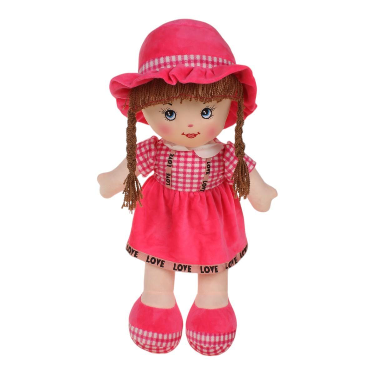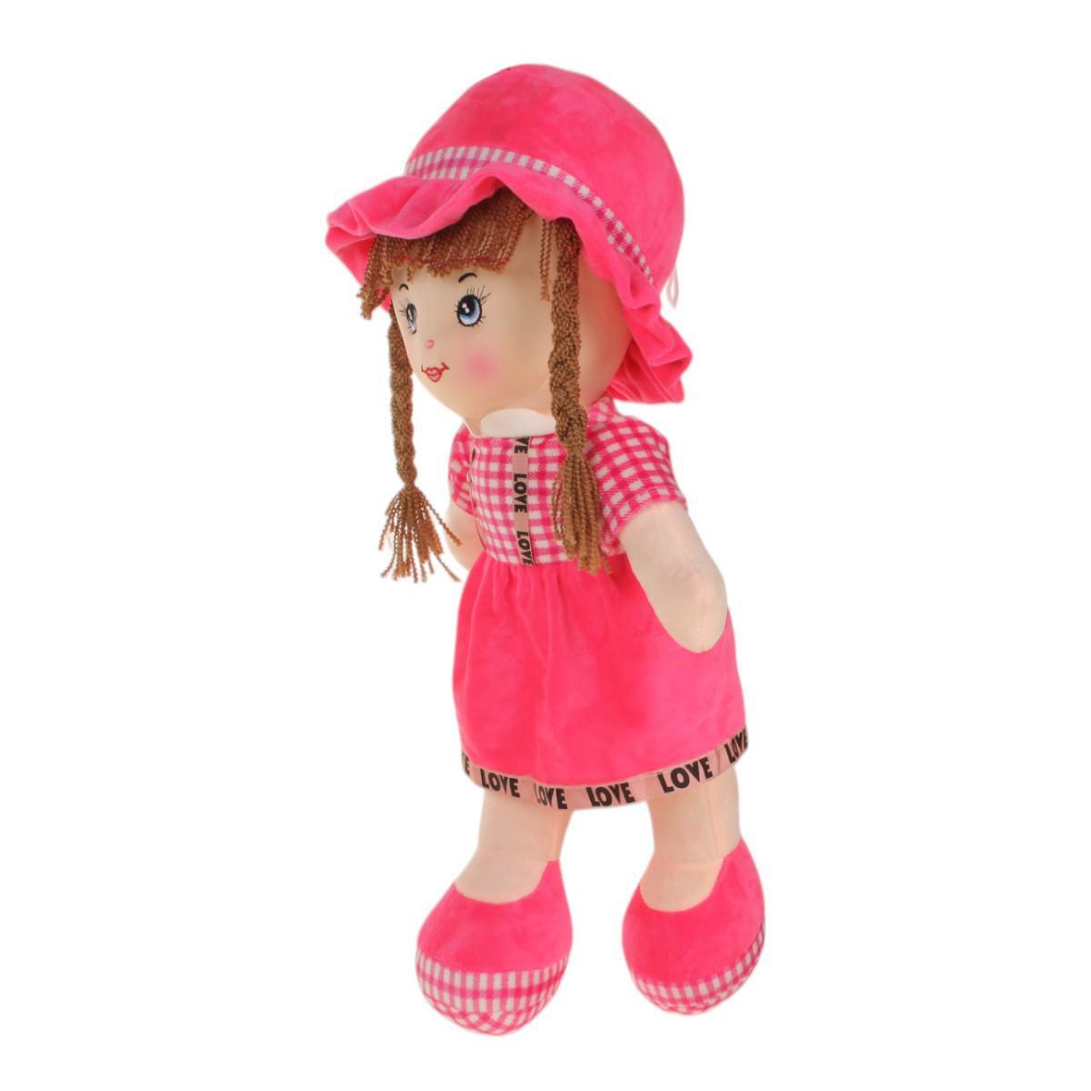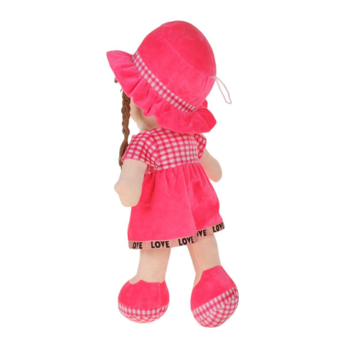 Размер куклы составляет 25 см, что делает ее удобной для игры и хранения. Платье выполнено в ярко-розовом цвете с клетчатым узором и украшено черной тесьмой с надписью 'LOVE'. Длинные косички и милое выражение лица придают кукле особый шарм. Обувь куклы — розовые тапочки, также с клетчатым рисунком, что завершает образ.