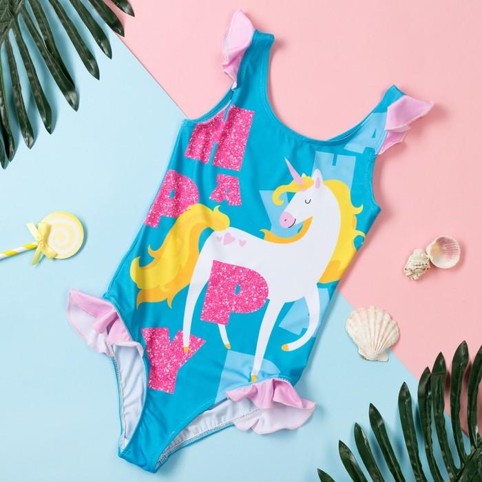 Купальник детский "Happy" с принтом единорога, размер 122-128, голубой, полиэстер 100%, KAFTAN