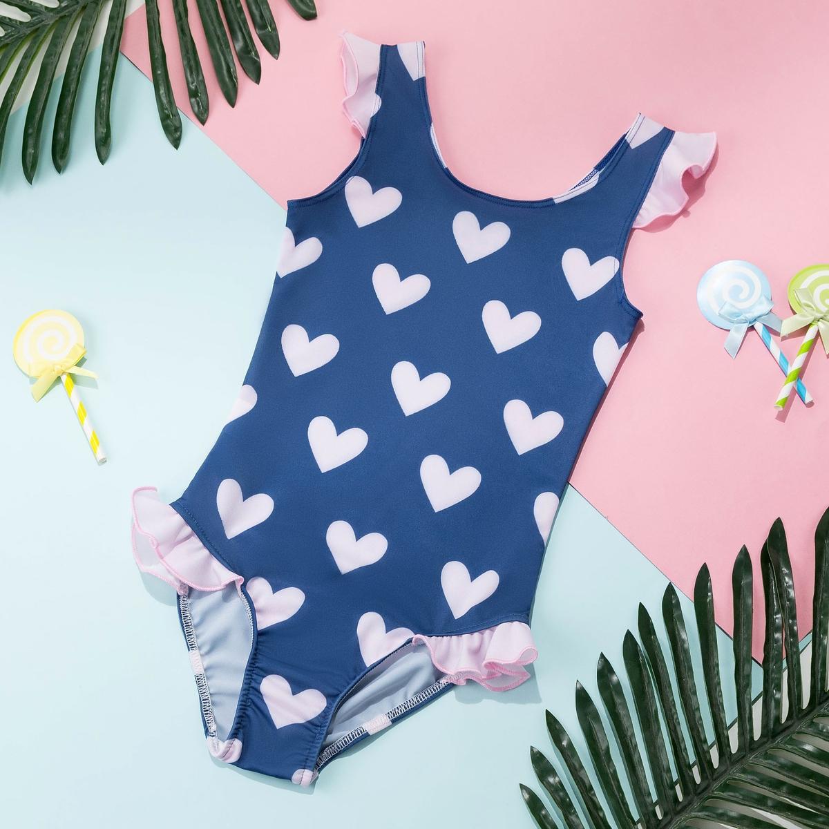 Купальник детский "Сердечки" с рюшами, размер 98-104, синий с белыми принтами, полиэстер 100%
