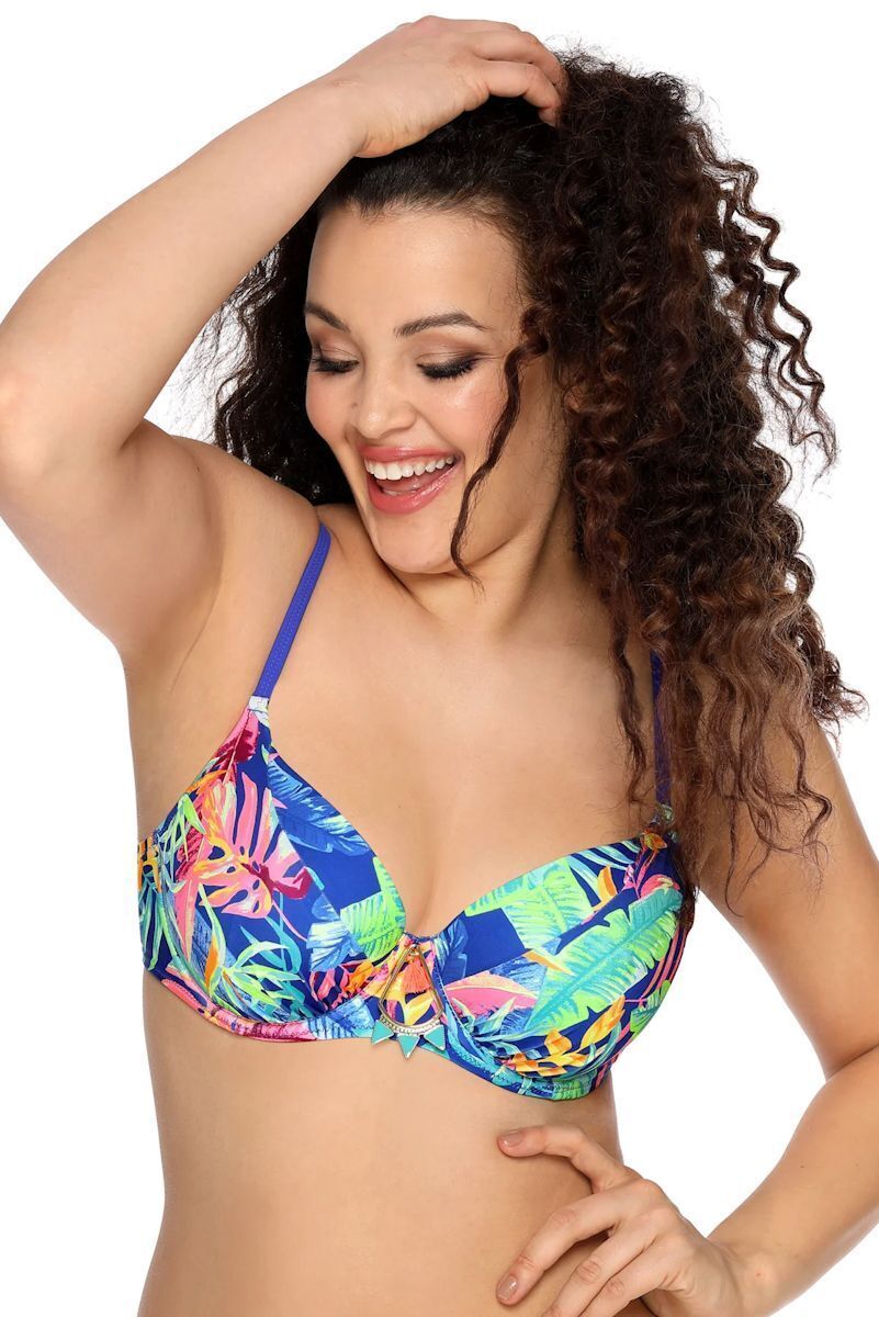 Купальный бюстгальтер AVA с ярким тропическим принтом — сочетание комфорта и эстетики. Регулируемые тонкие бретели и металлическая застёжка обеспечивают индивидуальную посадку, а шитые чашки на косточках гарантируют надёжную поддержку.