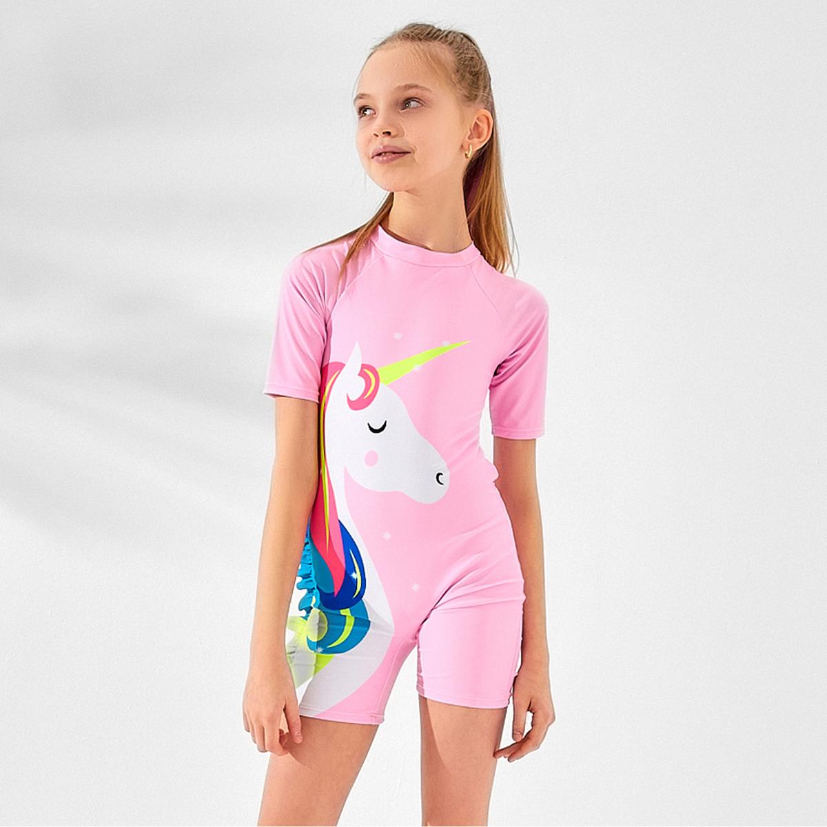Купальный костюм детский слитный, рост 128‑134 см, розовый с единорогом, 88% нейлон 12% эластан, комфортный и гибкий