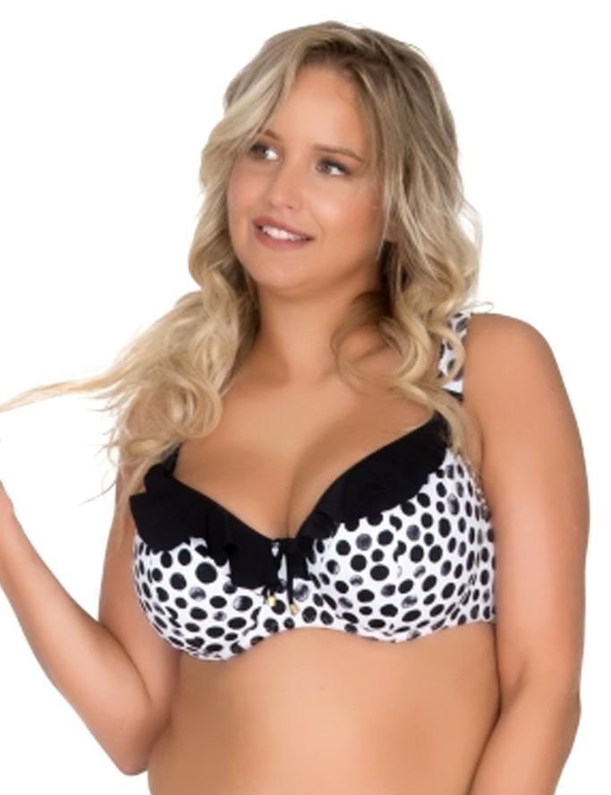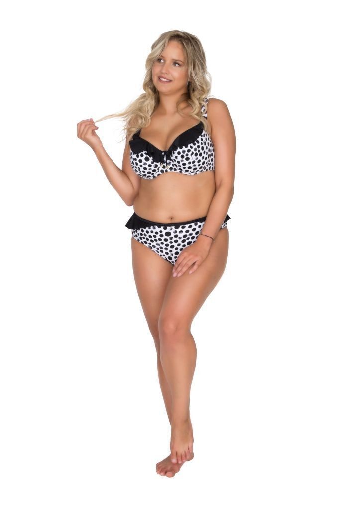 Модель размером 80J подходит для обладательниц пышного бюста. Черно-белый принт в горошек сочетается с любой пляжной одеждой, а декоративная рюша добавляет игривый акцент. Застежка на спине с тремя крючками обеспечивает удобство надевания.