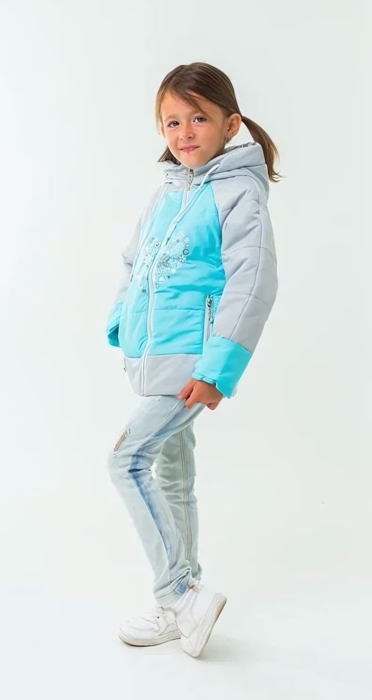 Эта демисезонная куртка сочетает утончённый дизайн и практичность, обеспечивая ребёнку комфорт и защиту в прохладную погоду. Лёгкий отблеск серебристых рукавов и капюшона гармонично сочетается с небесно-голубым тоном корпуса, создавая нежный, но выразительный образ. Такой вариант отлично подойдёт для прогулок, школы или встреч с друзьями.