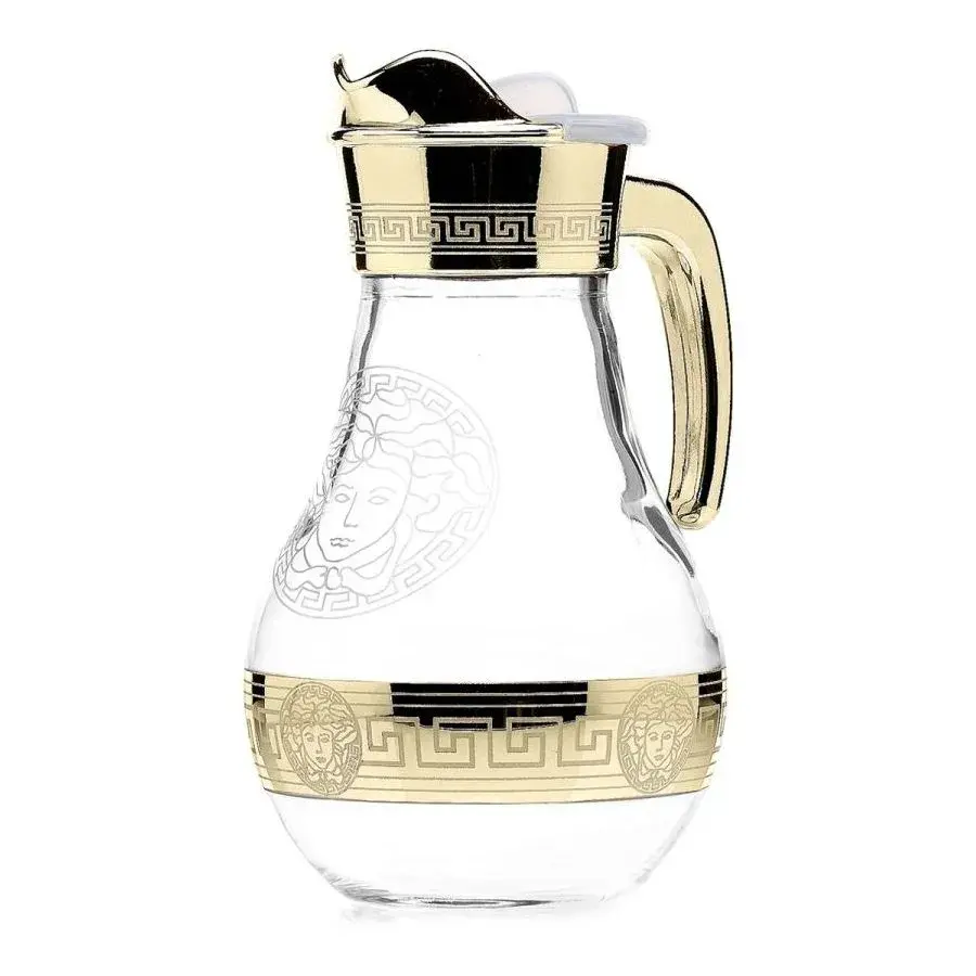 Стеклянный кувшин с золотым декором станет украшением вашего стола и практичным аксессуаром для подачи напитков. Сочетание прозрачного стекла с изысканными греческими орнаментами создаёт атмосферу античной роскоши в современном интерьере.