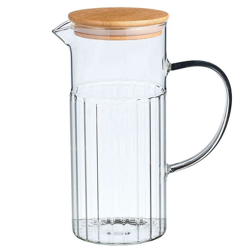 Этот стеклянный кувшин объёмом 1,13 литров идеально подходит для сервировки воды, соков или коктейлей дома и в офисе. Простая и удобная форма с вертикальными рельефами обеспечивает комфортное захватывание и стильный внешний вид. Бамбуковая крышка плотно закрывает посуду, сохраняя свежесть напитков и добавляя природный штрих.