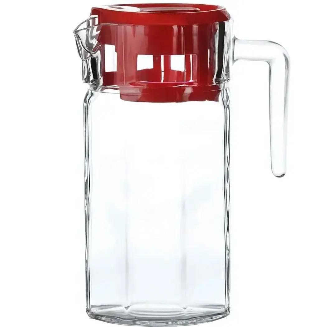 Объем кувшина составляет 1235 мл, что позволяет наливать достаточное количество напитка для всей семьи или компании. Красная крышка контрастирует с прозрачным стеклом, придавая кувшину яркий и привлекательный вид. Размеры кувшина идеально подходят для хранения и подачи напитков, а его гладкая поверхность облегчает уход и чистку.