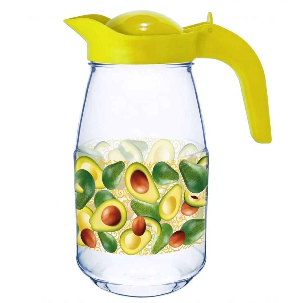 Корпус выполнен из стекла, крышка и ручка — из прочного пластика. Декоративный рисунок с изображением авокадо в зеленых и теплых оттенках гармонично сочетается с современной кухонной посудой и текстилем. Такой кувшин станет практичным дополнением кухни и аккуратным акцентом в сервировке.