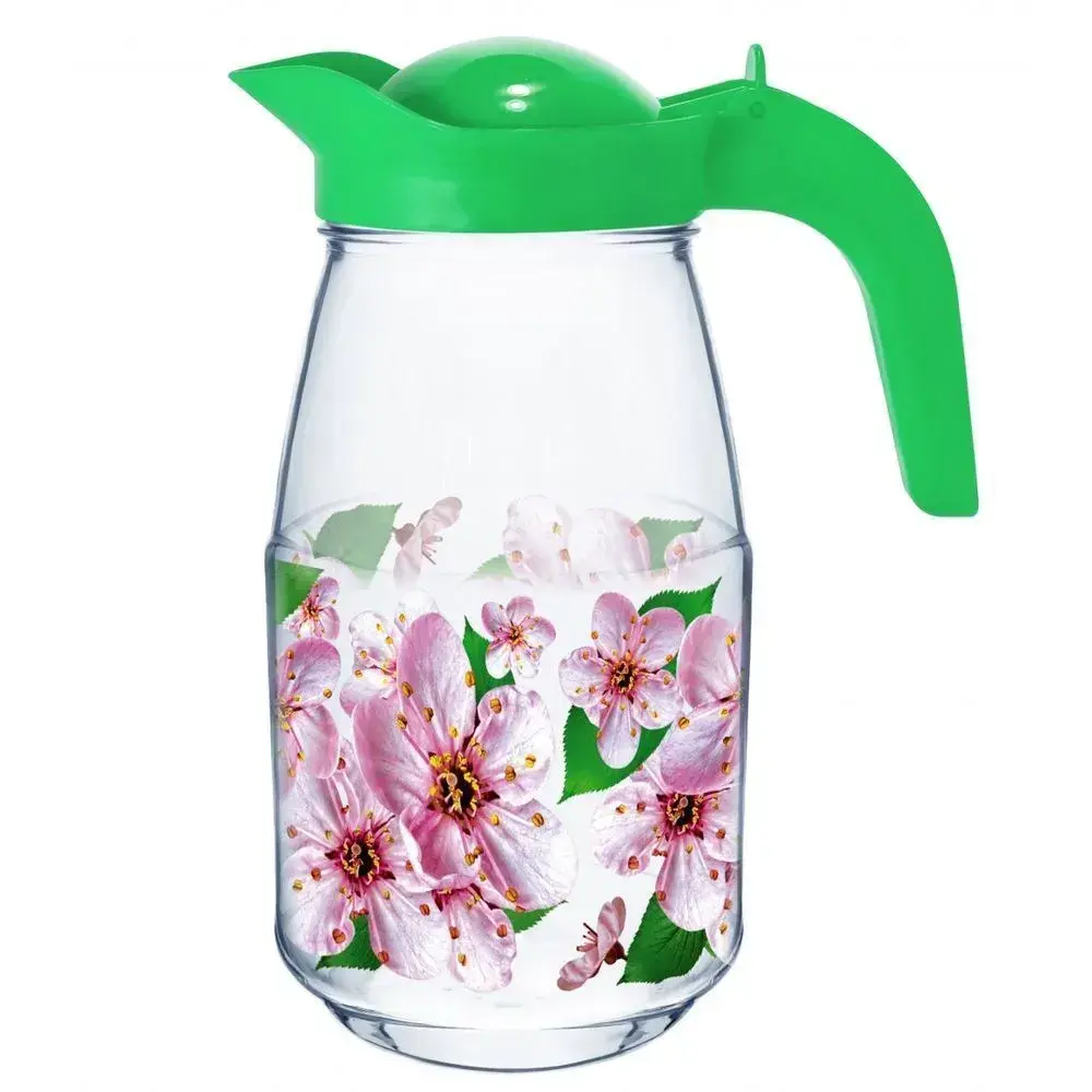 Кувшин стеклянный с декором «Сакура», 1.5 л, зеленая крышка и ручка