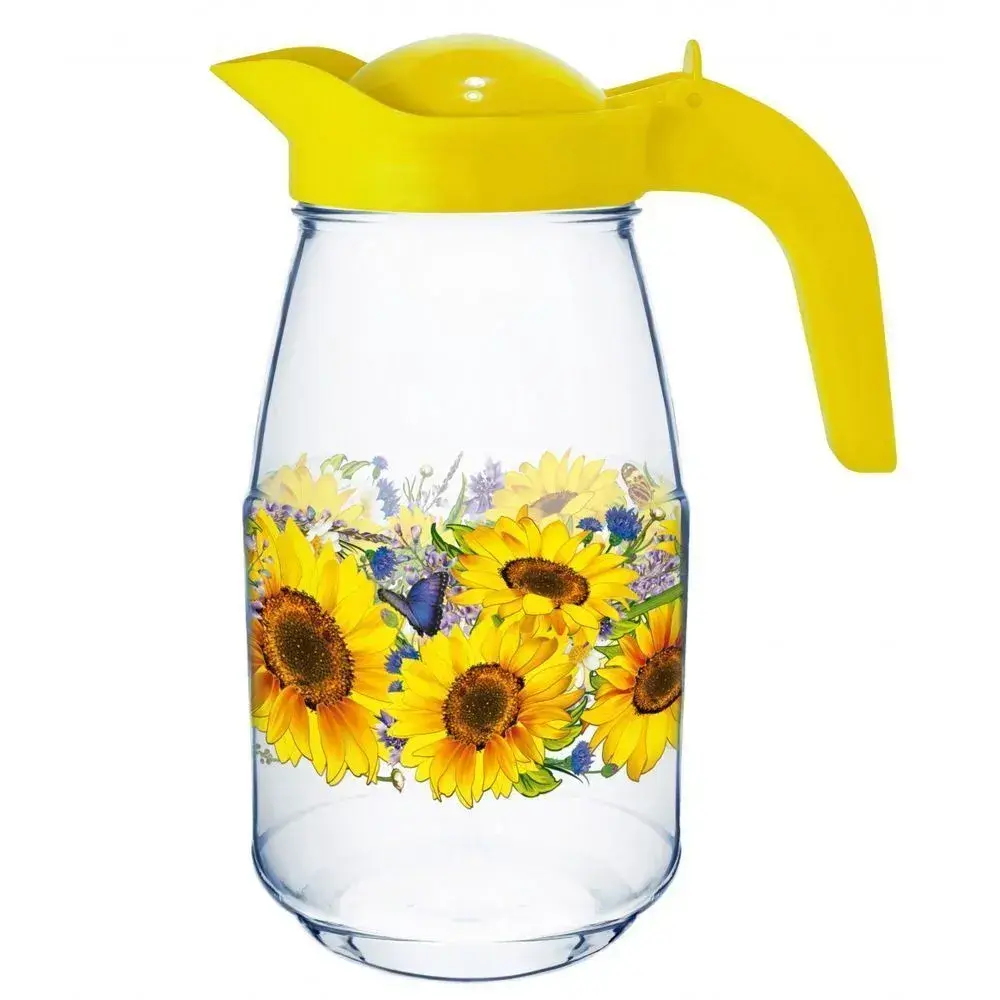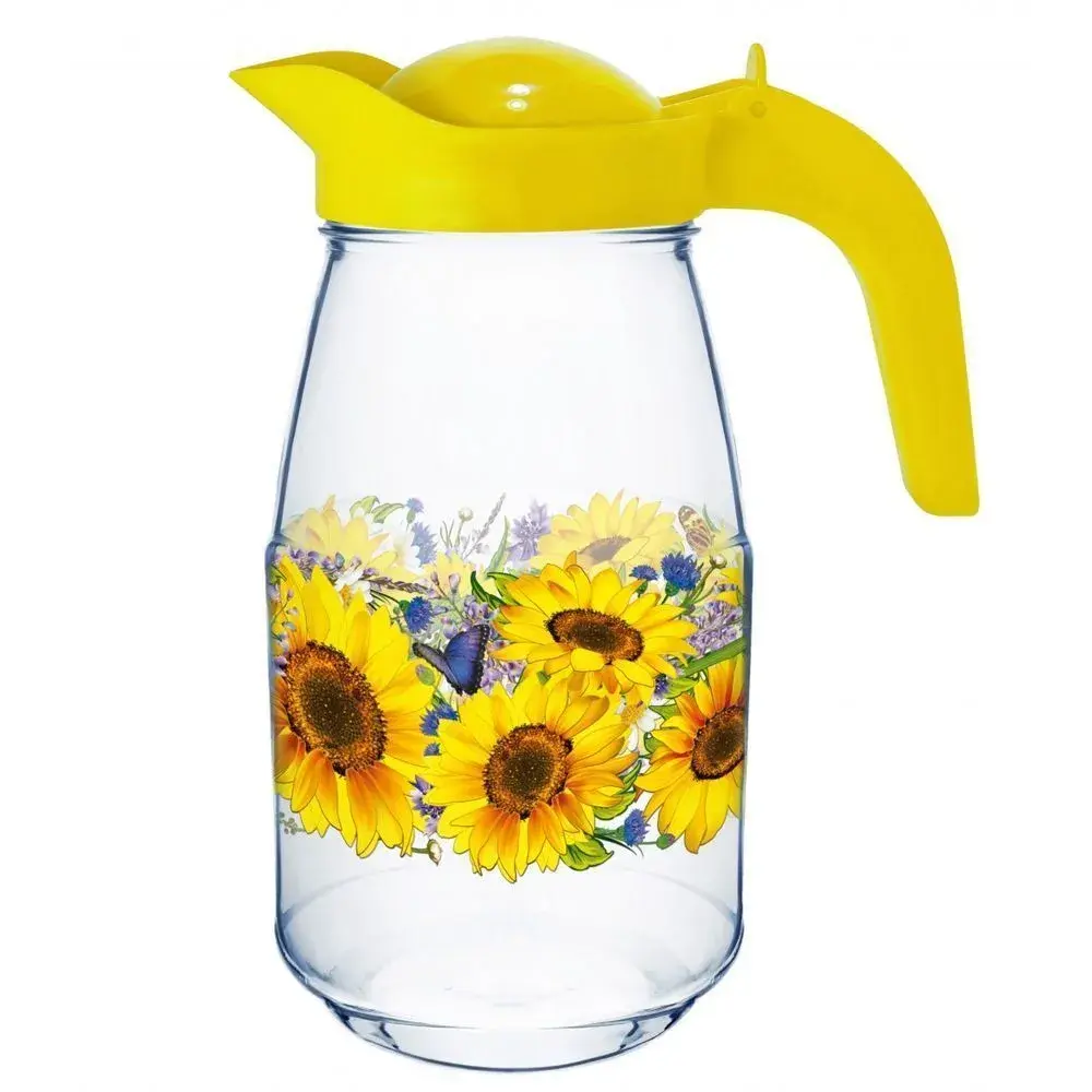 Внутренний декор с подсолнухами, мелкими цветами и бабочкой сохраняет яркость красок даже при контакте с жидкостями. Прозрачная основа визуально увеличивает пространство, позволяя использовать кувшин как самостоятельный элемент декора.