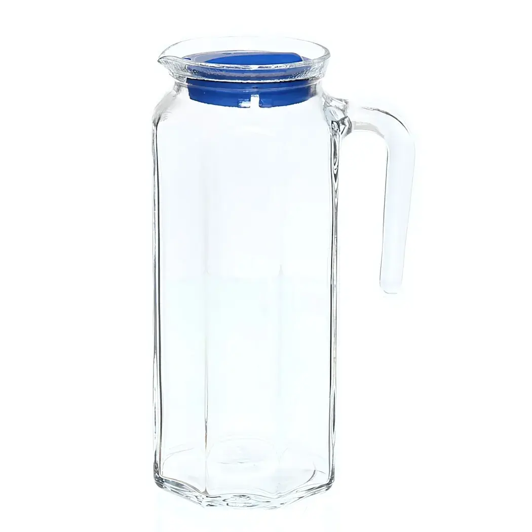 Кувшин выполнен из высококачественного стекла, что гарантирует его надежность и долговечность. Высота кувшина средняя, что делает его удобным для хранения и использования. Синий пластиковый элемент на крышке не только привлекает внимание, но и обеспечивает надежное закрытие, предотвращая проливание.