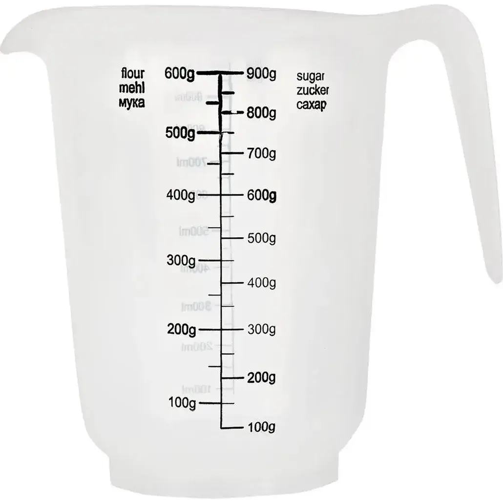 Мерный кувшин особенно полезен при выпечке, где важна точность пропорций. Шкала с отметками от 100 до 900 грамм позволяет отмерять как небольшие, так и большие порции продуктов.