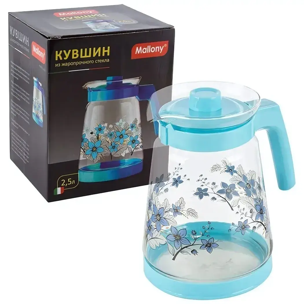 Чайный кувшин 2,5 л из жаропрочного стекла с пластиковой ручкой и крышкой, синий с цветочным узором