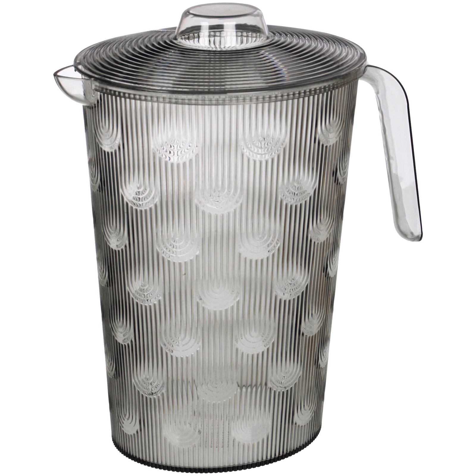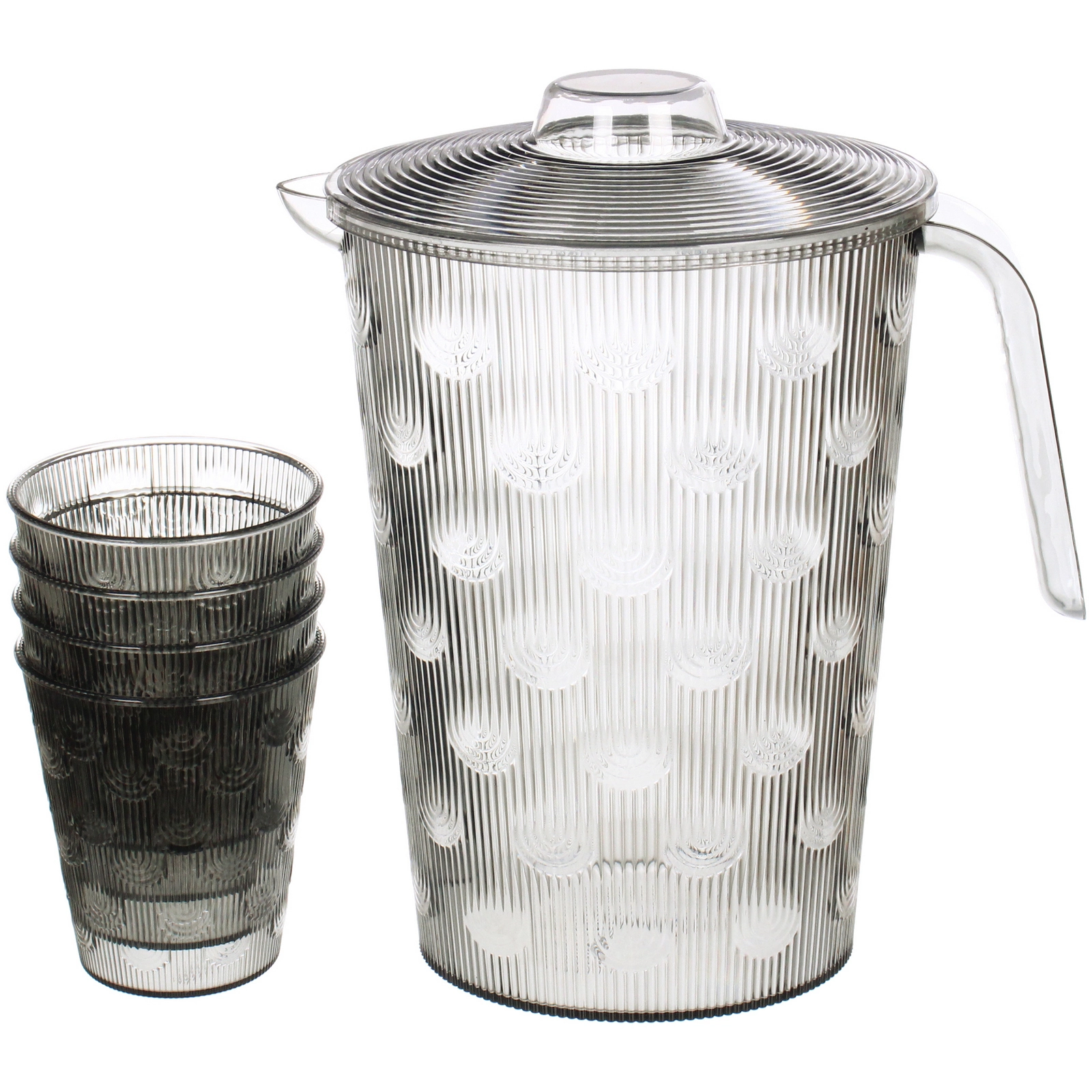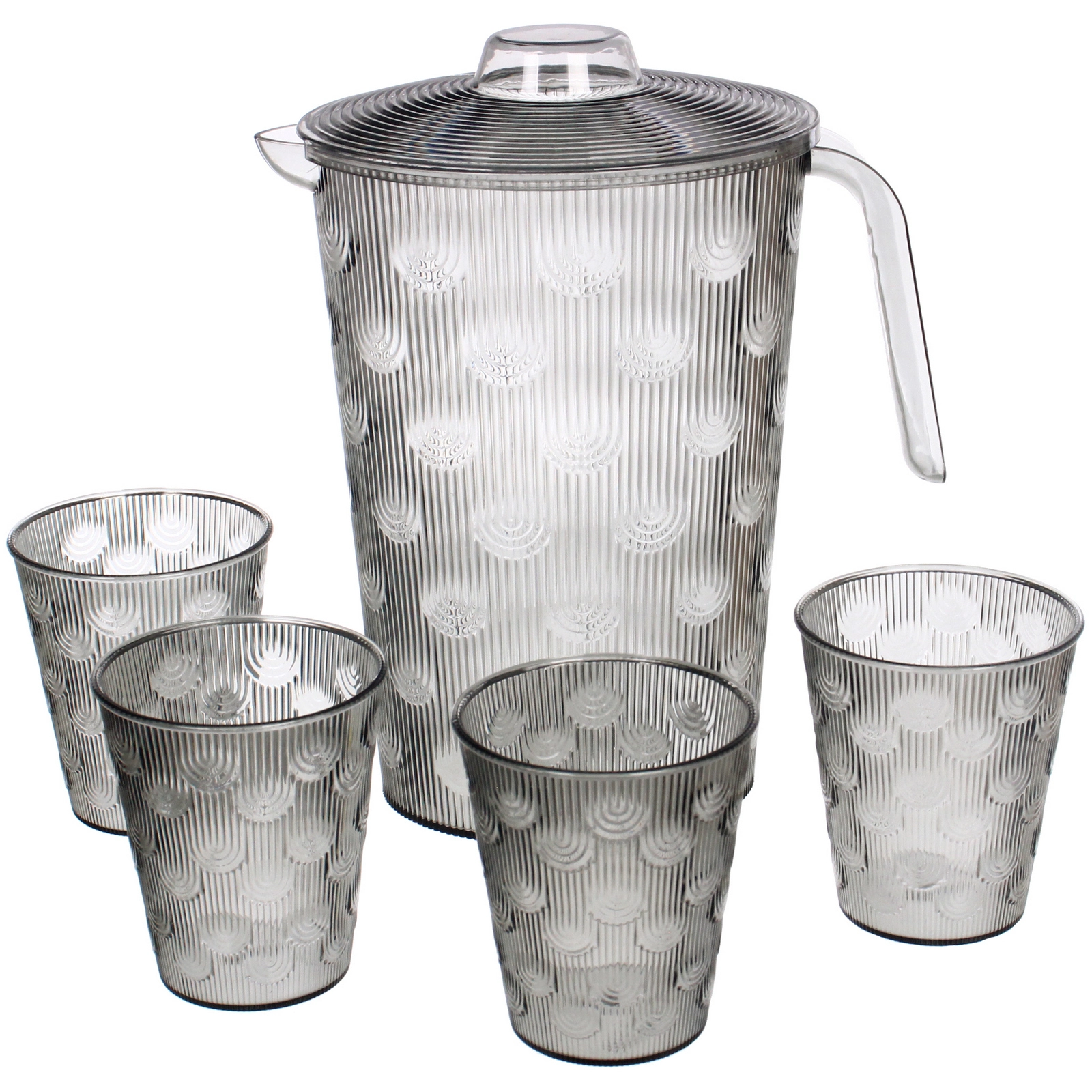 Все элементы выполнены из пластика и имеют прозрачную дымчато-серую расцветку. Кувшин объемом 1.5 л дополнен крышкой с удобной ручкой, стаканы объемом 200 мл имеют устойчивую форму. Рельефный узор не только украшает поверхность, но и делает использование более комфортным. Набор станет удобным решением для повседневного использования и поможет поддерживать порядок на кухне.
