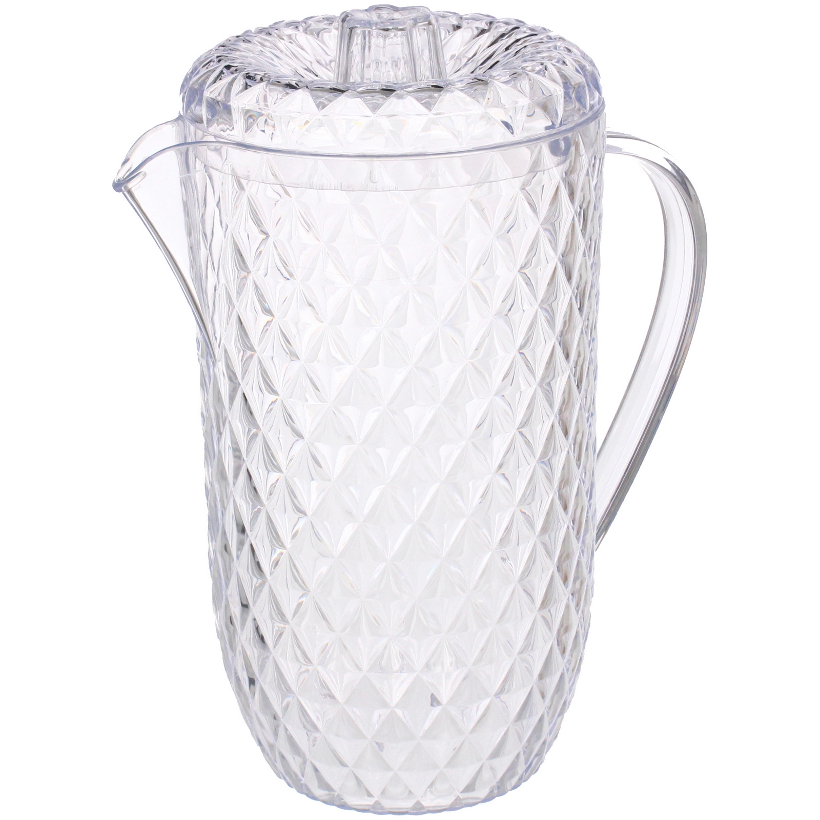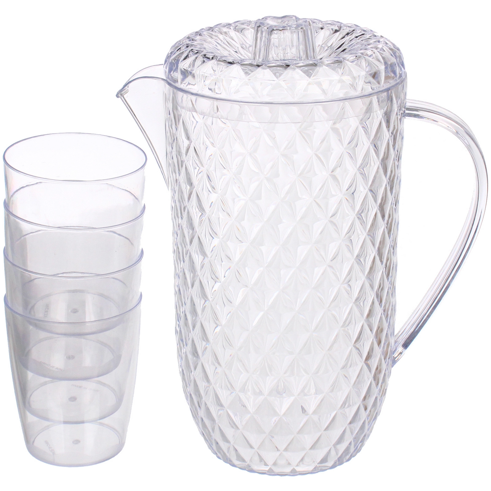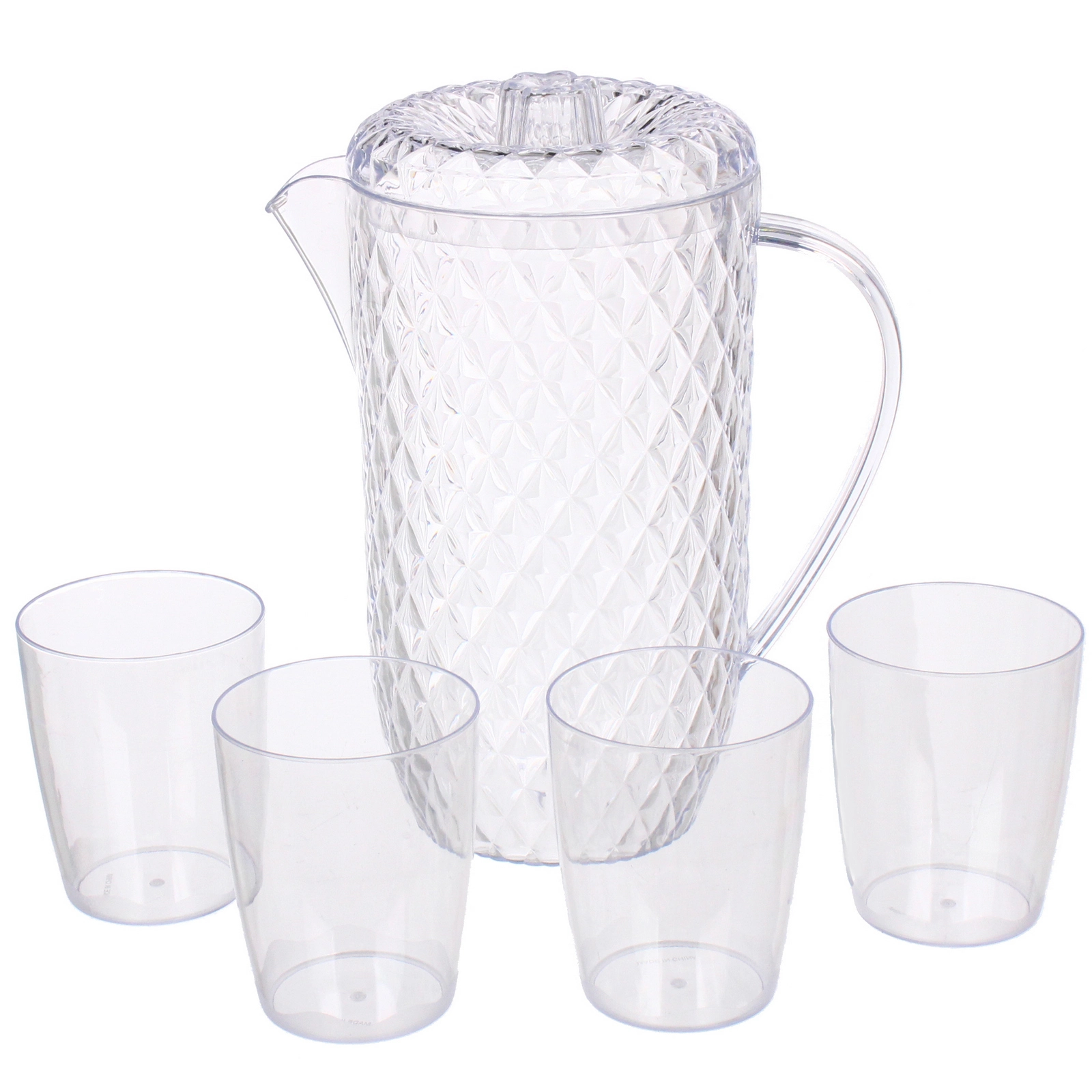 Изделия выполнены из прозрачного пластика. Кувшин оснащён удобной ручкой и крышкой с рельефной поверхностью, обеспечивающей плотную посадку. Объем кувшина — 1.7 л, объем каждого стакана — 250 мл. Набор рассчитан на повседневное применение и станет практичным выбором для сервировки прохладительных напитков в любое время года.