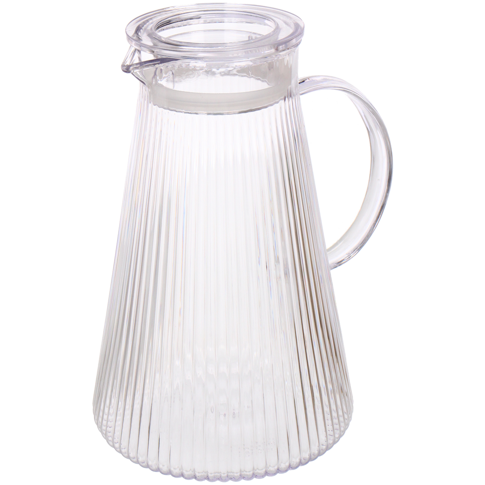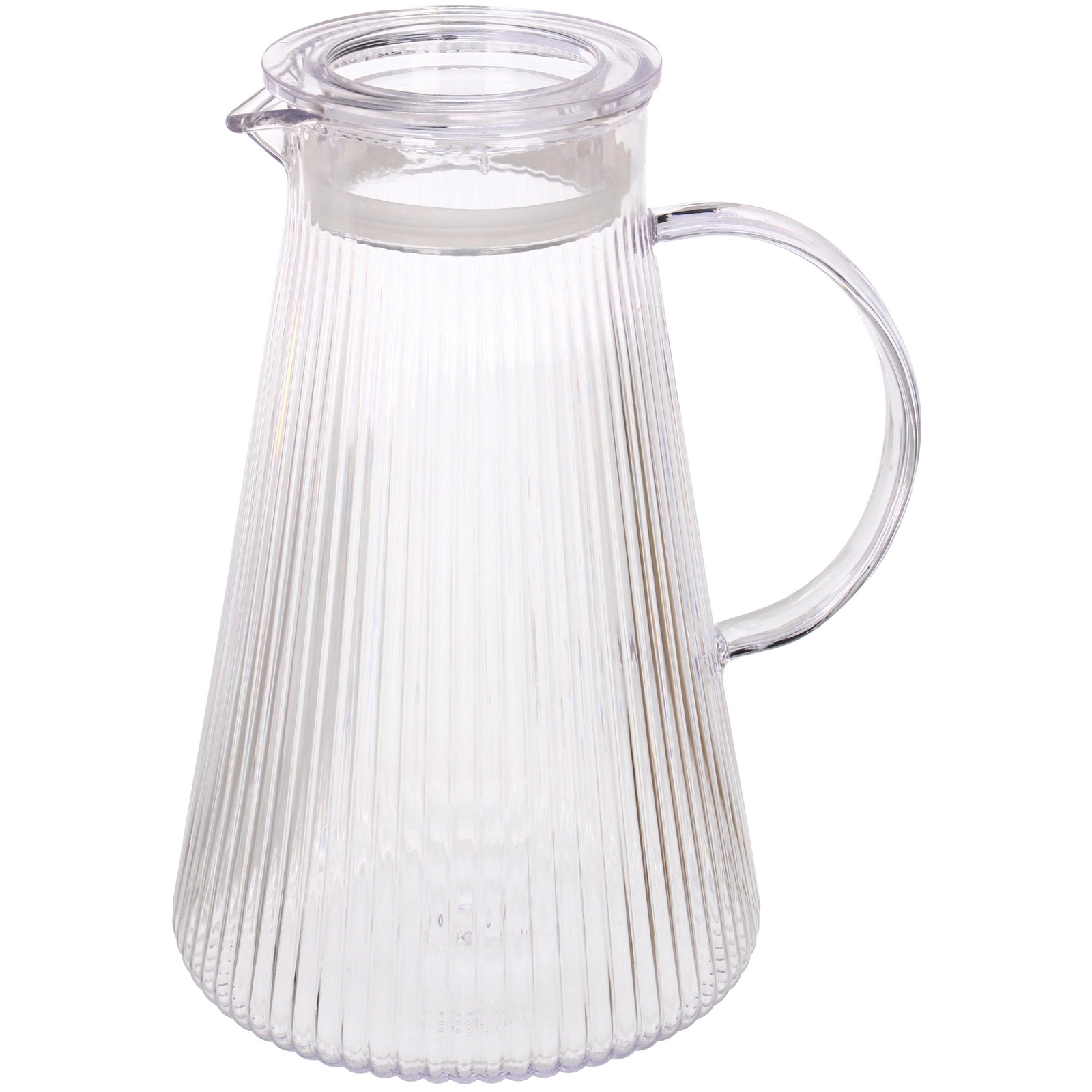 Изделие выполнено из прочного пластика. Коническая форма с рельефной поверхностью не только придает аккуратный внешний вид, но и делает кувшин устойчивым. Объем 1.8 л оптимален для ежедневного использования: достаточно вместительный для компании и при этом удобный для хранения в холодильнике.