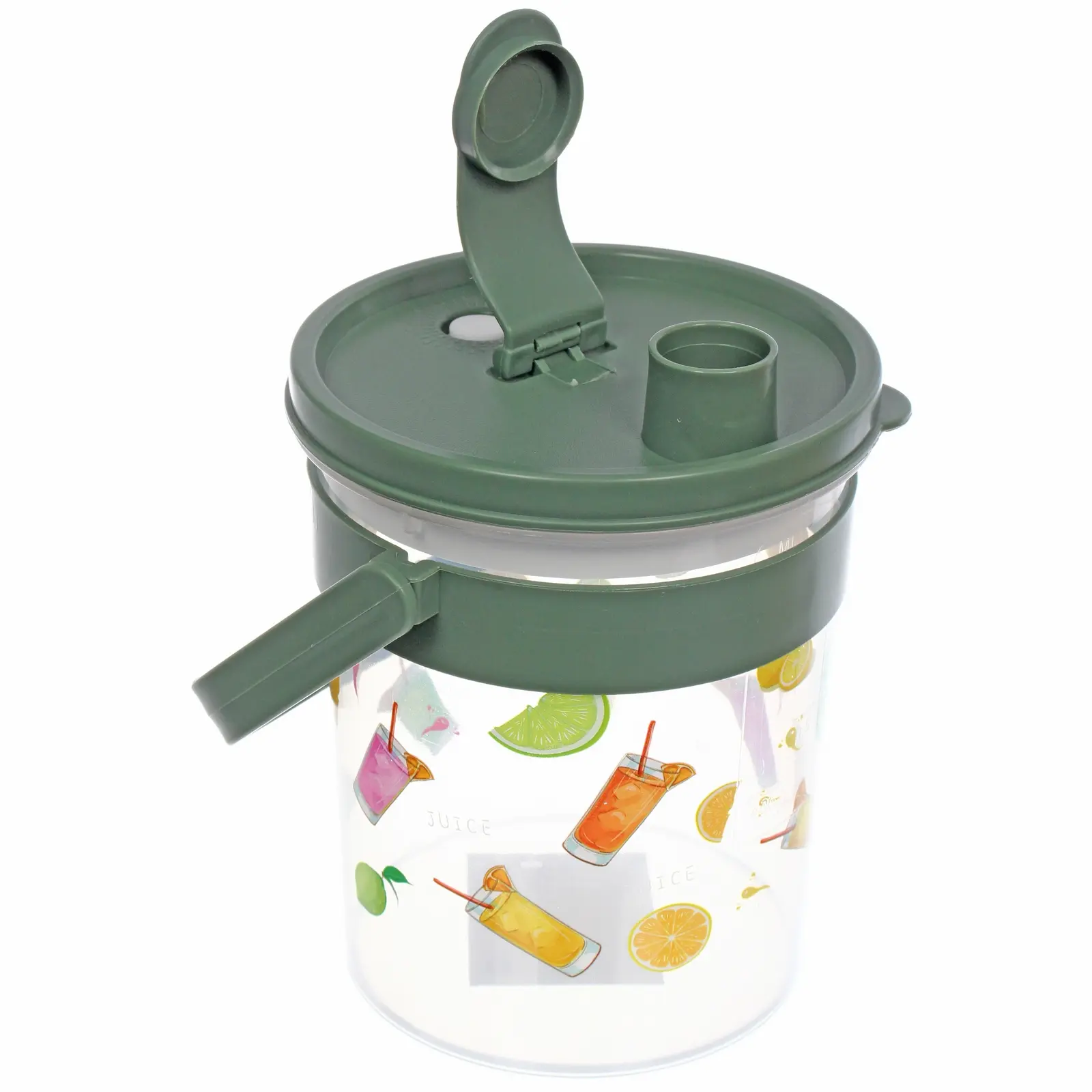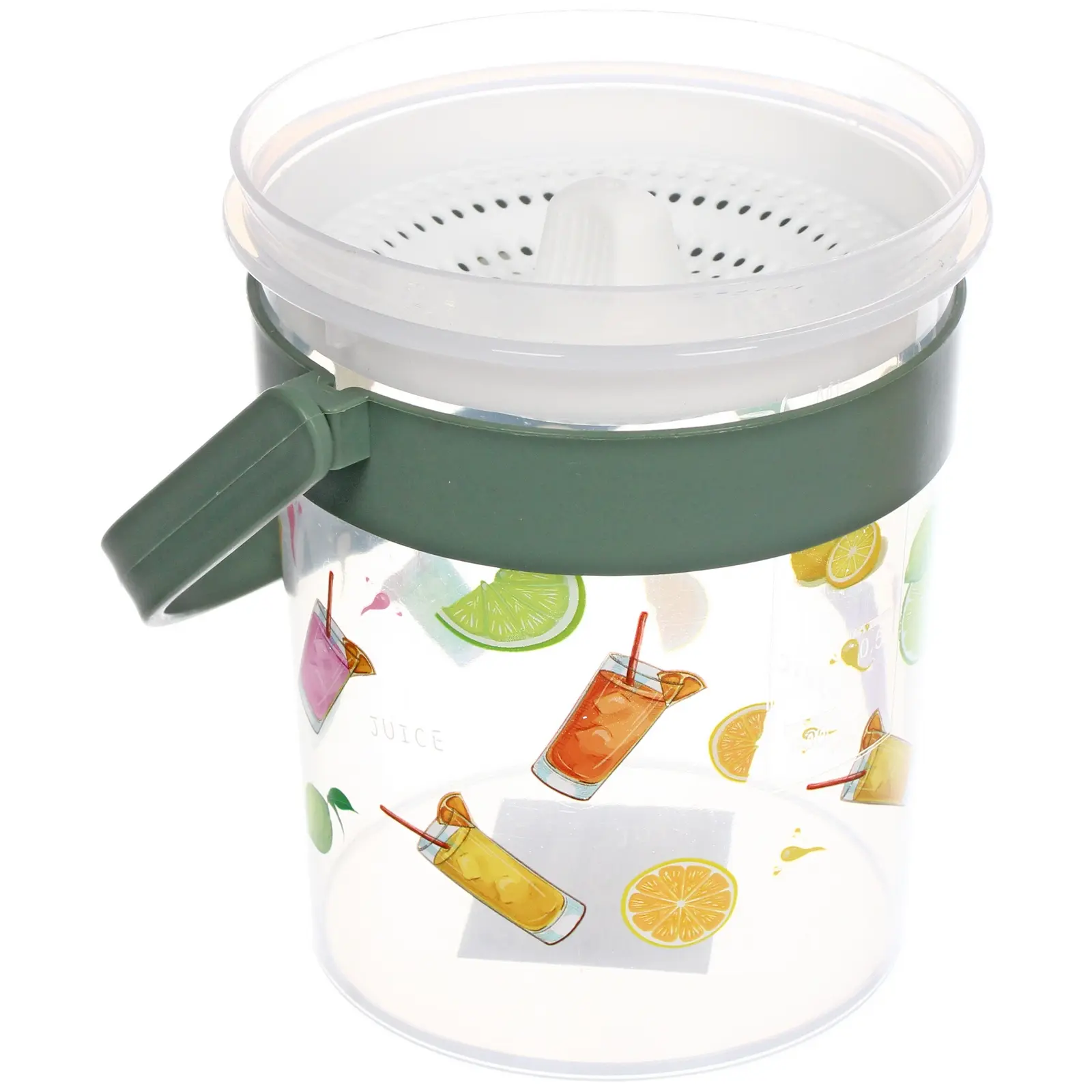 Кувшин имеет объем 850мл, кружки – по 300мл каждая. Все элементы выполнены из высококачественного пластика. Комплект представлен в привлекательном зеленом цвете с яркими принтами напитков и фруктов.