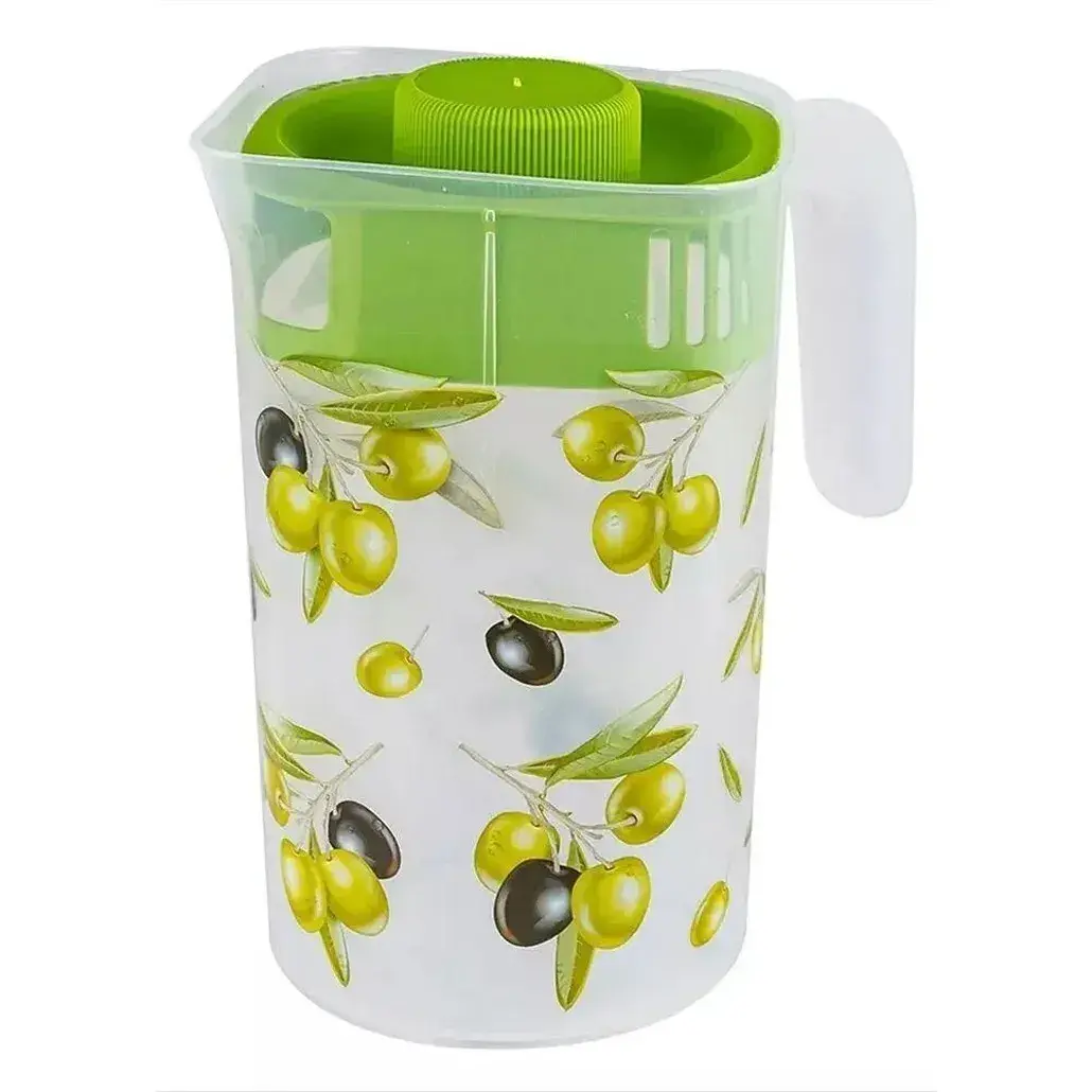 Прозрачный пластиковый кувшин с декором оливок станет изюминкой вашего стола. Удобная крышка с кнопкой обеспечивает герметичность и лёгкое использование, а эргономичная ручка гарантирует комфортный захват.