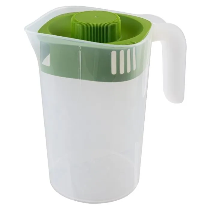 Кувшин оснащён удобной широкой ручкой из белого пластика, которая обеспечивает надёжный и комфортный захват даже мокрыми руками. Зелёная крышка с центральным рифлёным элементом легко открывается и закрывается, надёжно защищая содержимое от пыли и проливания. Специальный носик для наливания позволяет аккуратно разливать напитки без капель и подтёков.