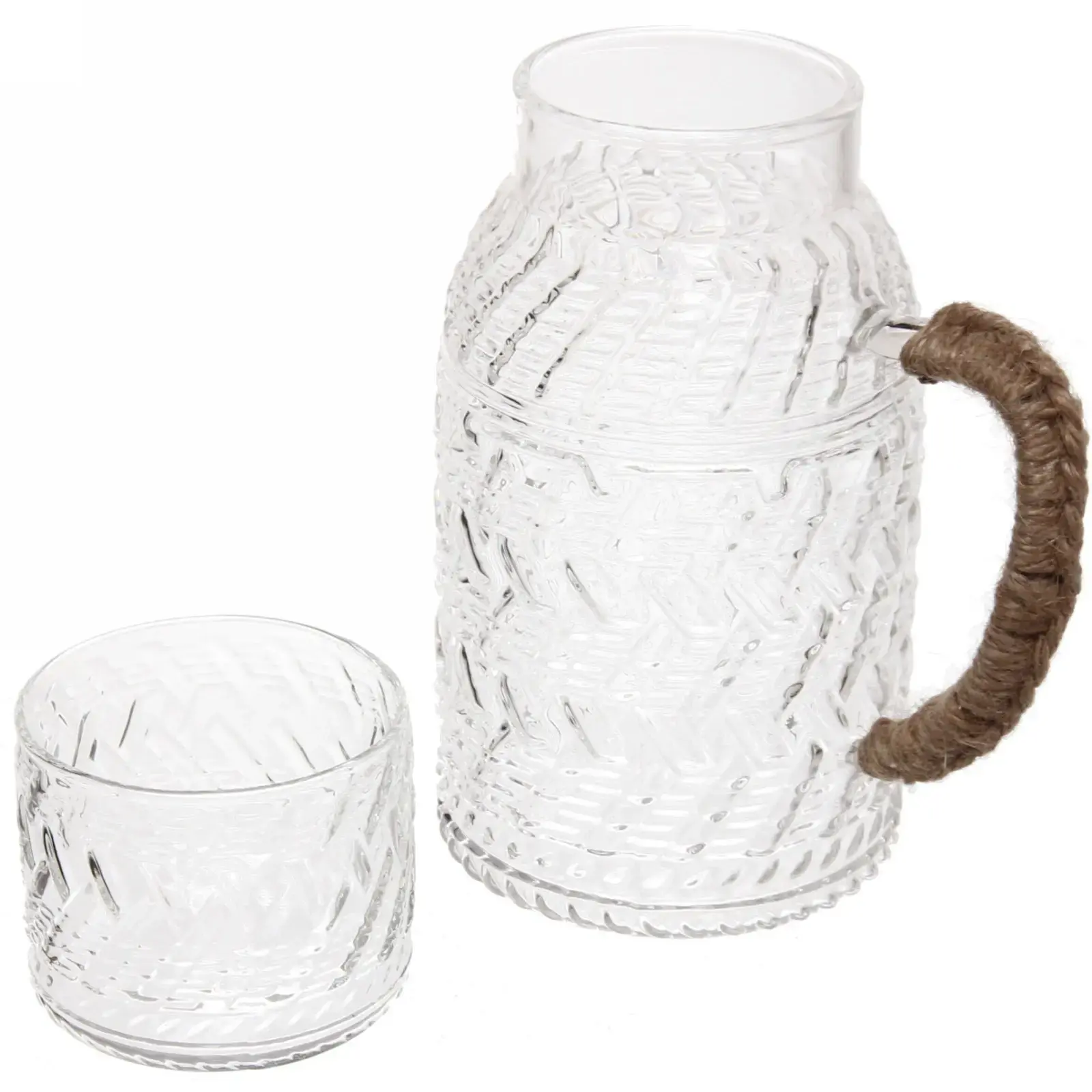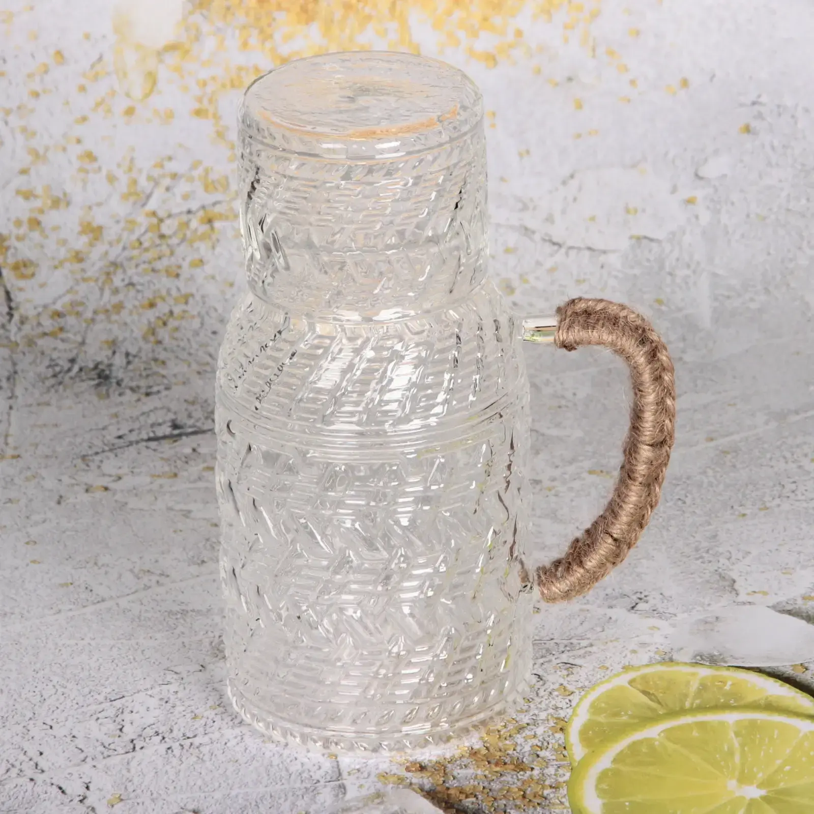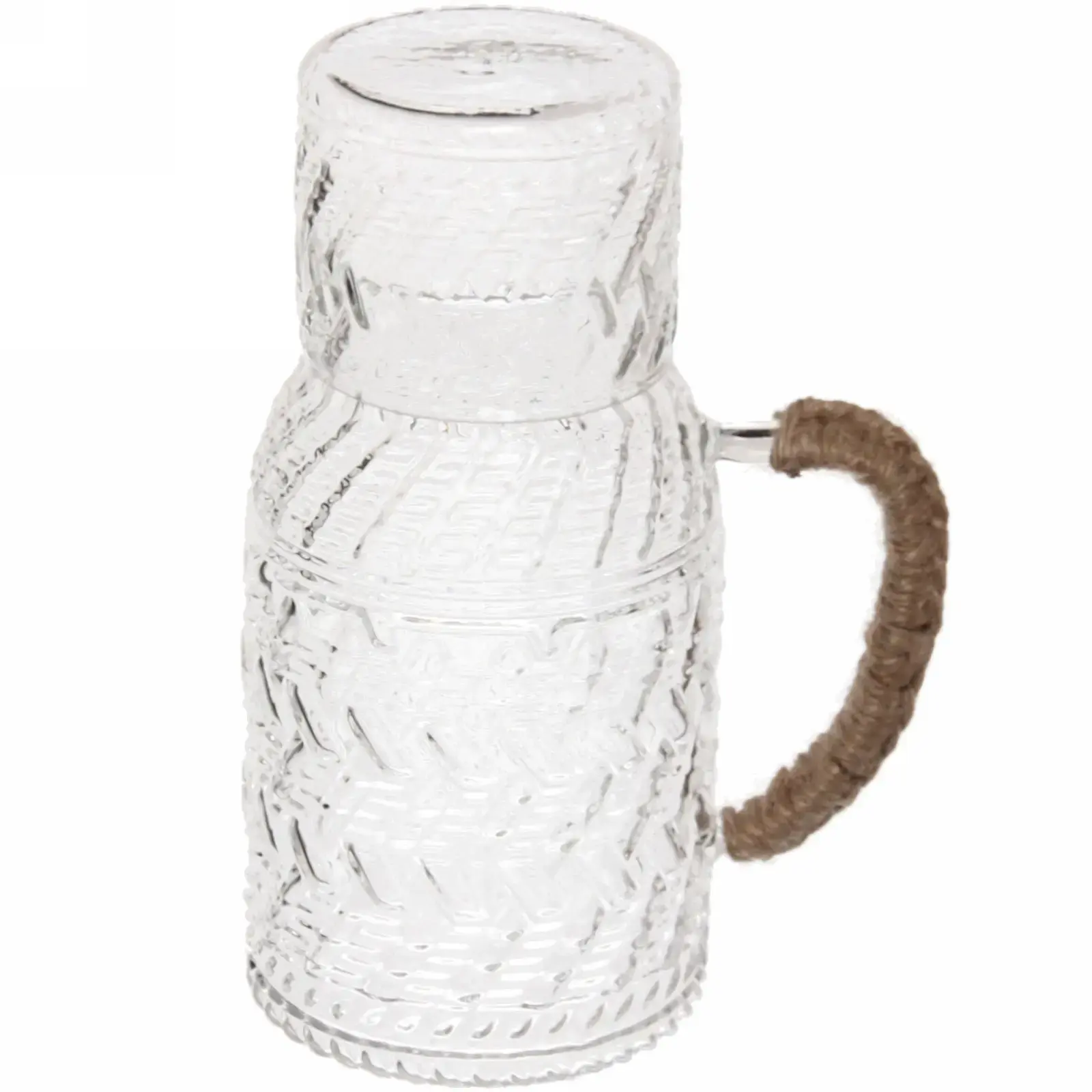 Стеклянный кувшин «ICE» с комплектом стакана — идеальное решение для подачи воды, соков, лимонадов и коктейлей. Рельефный геометрический узор создаёт игру света, а натуральная плетёная ручка обеспечивает удобный захват даже при полном наполнении.