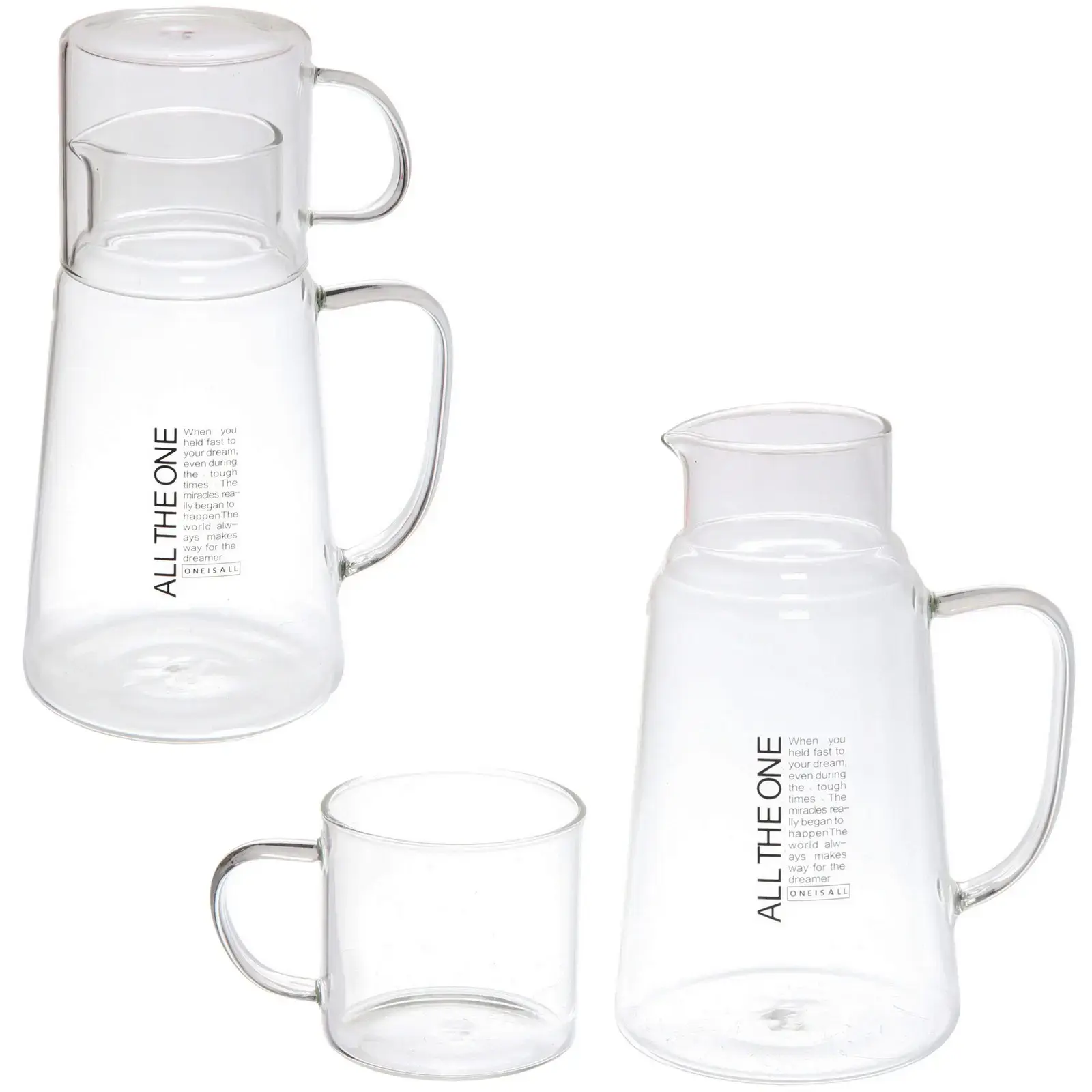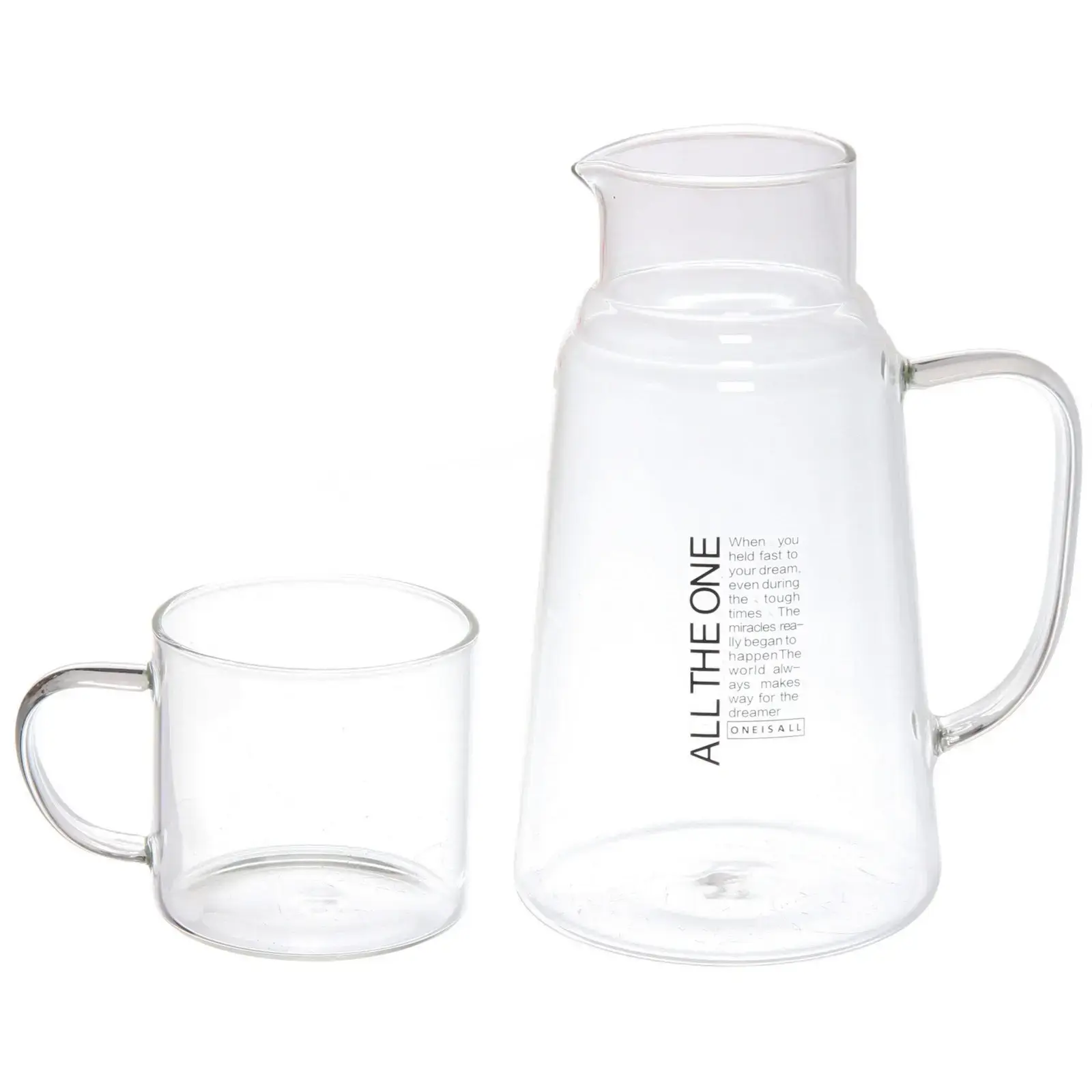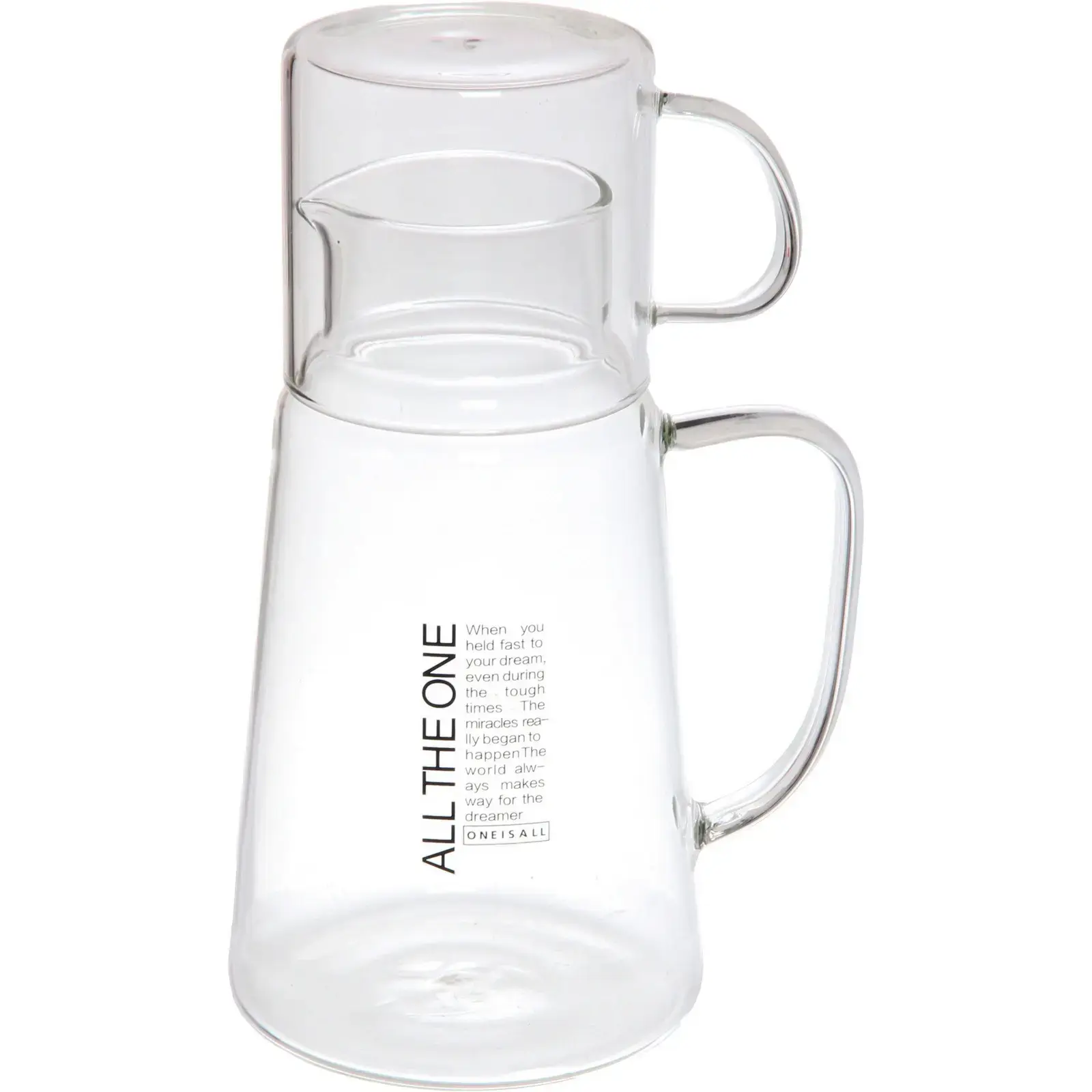 Кувшин и стакан выполнены из высококачественного стекла, что обеспечивает долговечность и легкость в уходе. Стеклянная посуда не подвержена образованию налета и накипи, легко моется и не царапается, что делает ее идеальным выбором для ежедневного использования. Удобная ручка кувшина обеспечивает комфортный захват, а сужающаяся форма позволяет легко наливать напитки.