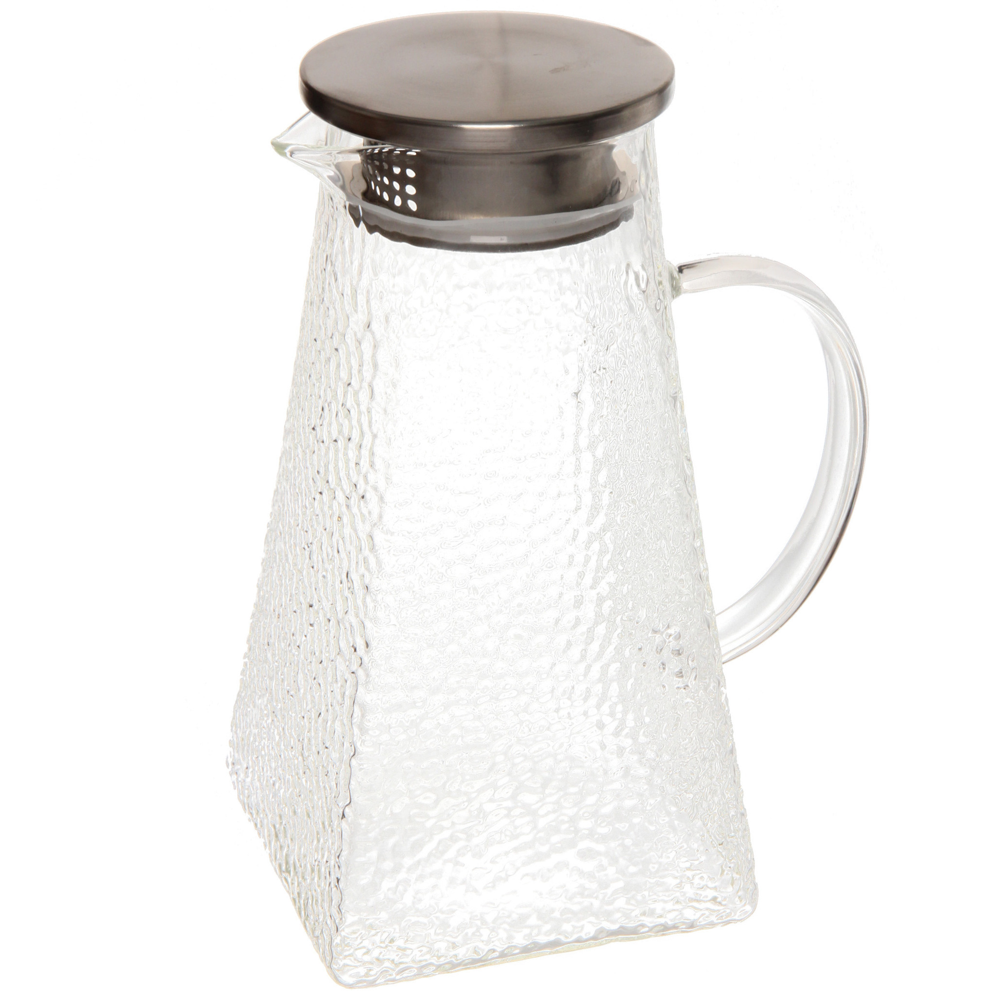 Кувшин имеет трапециевидную форму, что не только придает ему стильный вид, но и облегчает наливание. Металлическая крышка с сетчатой структурой позволяет фильтровать напитки, что делает его идеальным для подачи лимонадов, коктейлей или даже воды с фруктами. Удобная ручка обеспечивает надежный захват, а прозрачный материал позволяет контролировать уровень жидкости внутри.