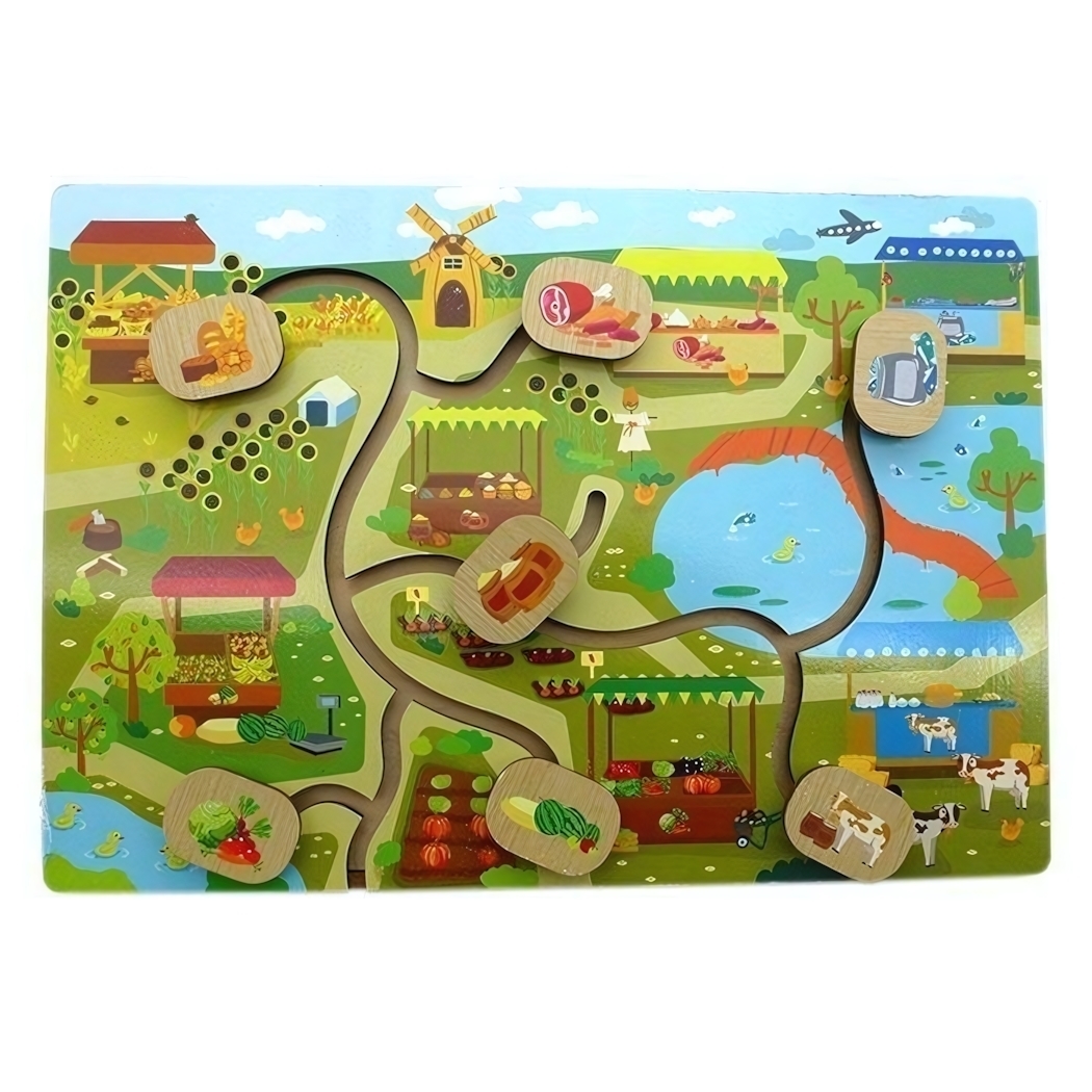 Развивающий лабиринт "Рынок" для детей, дерево с подвижными фишками, обучение классификации