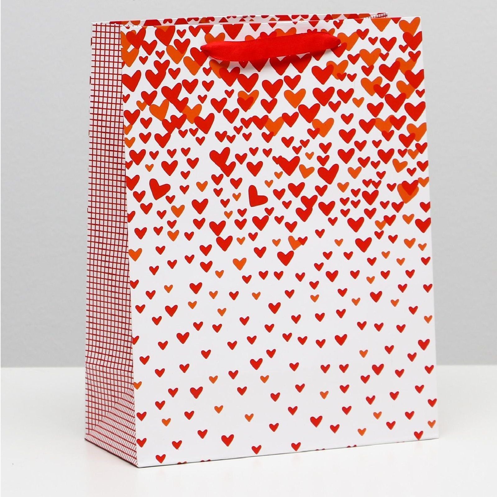 Белый фон пакета служит элегантным холстом для россыпи красных и оранжевых сердечек разного размера. Этот универсальный рисунок подходит как для женских, так и для мужских подарков (в зависимости от содержимого). Боковые грани украшены стильным красно-белым клетчатым узором, который добавляет пакету динамичности и завершенности образа.