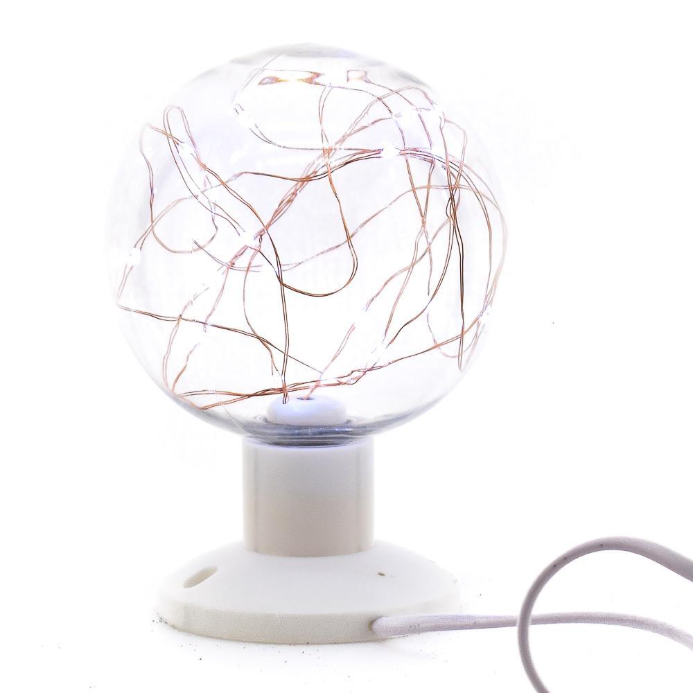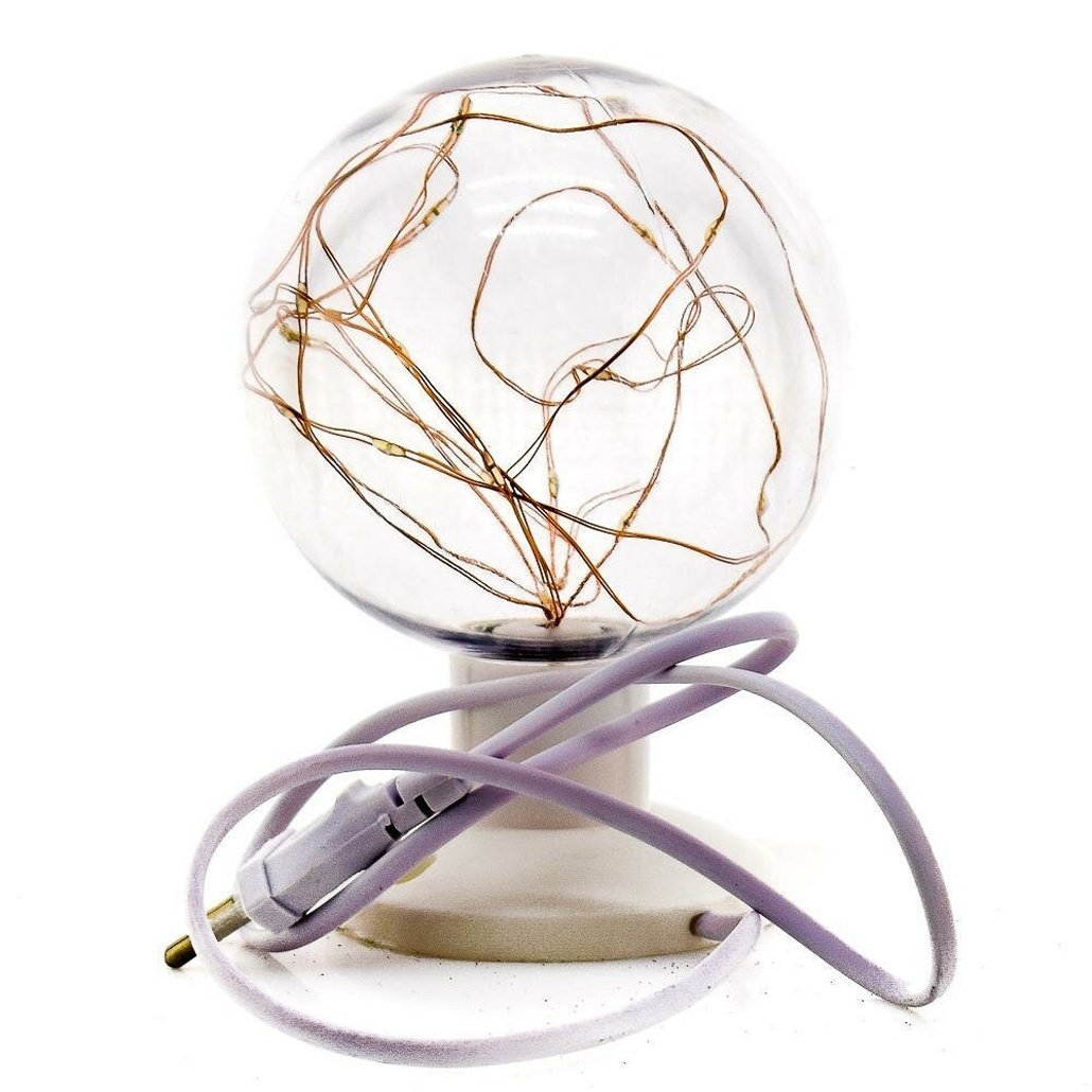 Шар выполнен из прозрачного пластика, внутри расположен медный провод, а основание – белое пластиковое. Лампа питается от обычного шнура с вилкой, длина шнура позволяет разместить её в любой удобной точке комнаты.