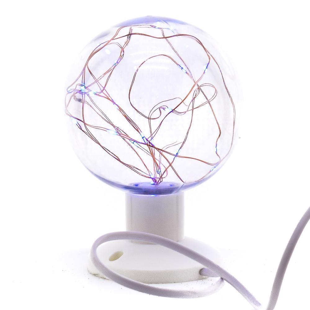 Эта уникальная лампочка станет идеальным новогодним аксессуаром для вашего дома. С её помощью вы сможете легко создать уют и магию праздника. Прозрачная сфера с гирляндой внутри, сияющей синим светом, добавит нотки волшебства в любое помещение. Работает от стандартной розетки, что делает её удобной в использовании.