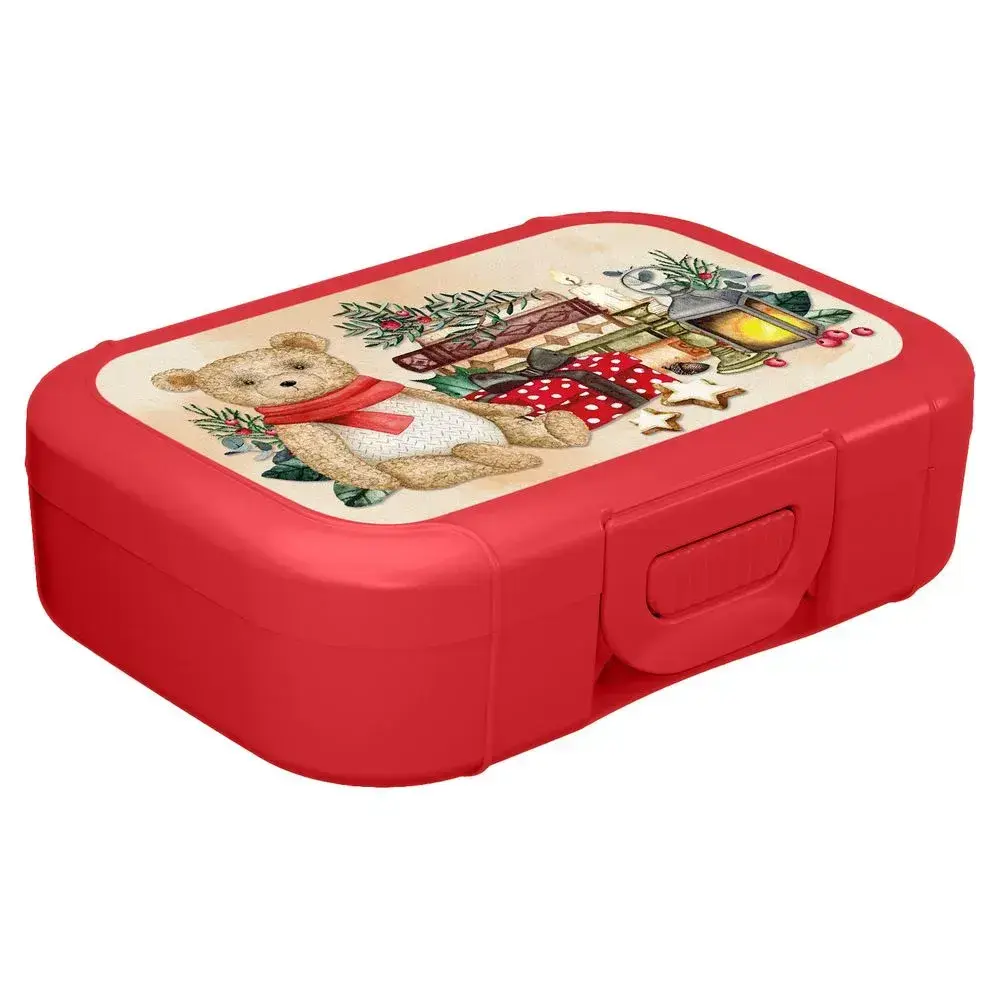 Ланч-бокс изготовлен из пластика, не имеет посторонних надписей или маркировки на видимой стороне. Цвет - насыщенный красный. Крышка украшена красочным рисунком с медведем и зимними элементами. Надежный замок встроен в корпус, что удобно для быстрой и безопасной транспортировки продуктов.