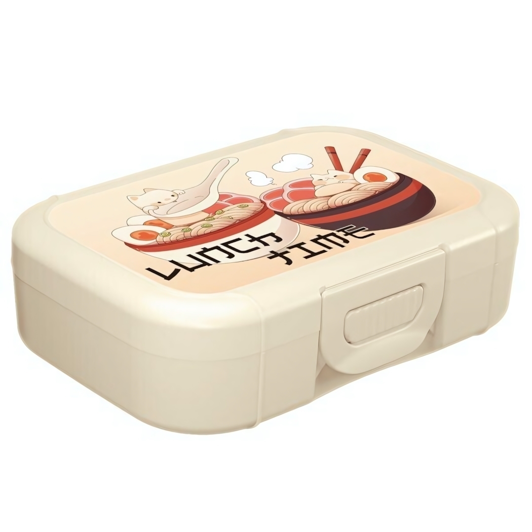 Вместительный контейнер легко помещает бутерброды, фрукты, салаты, напитки и другие закуски. Берите его с собой в школу или офис, используйте для детского завтрака в дороге. Декор в виде милых котиков и мисок лапши поднимет настроение при каждом приеме пищи.