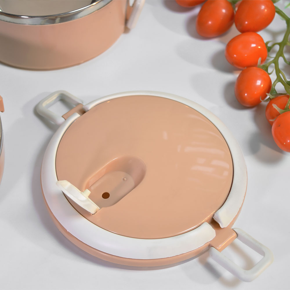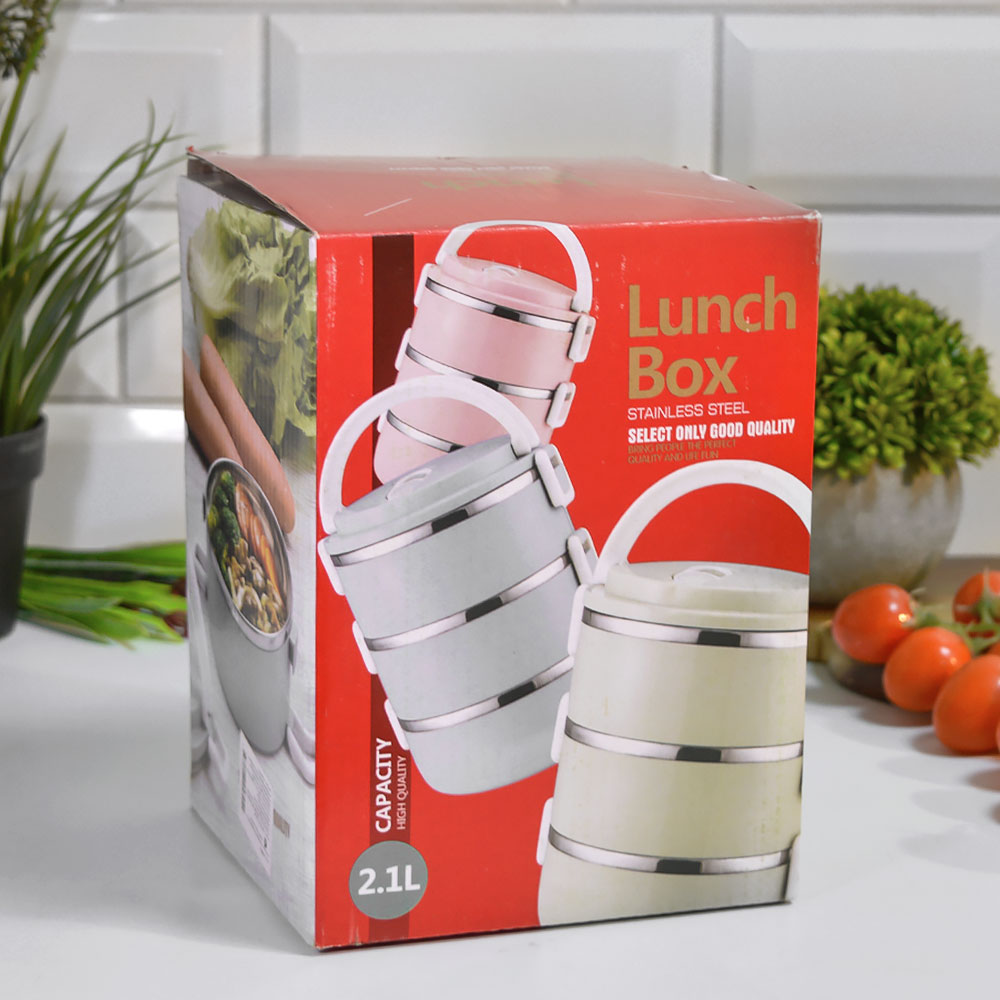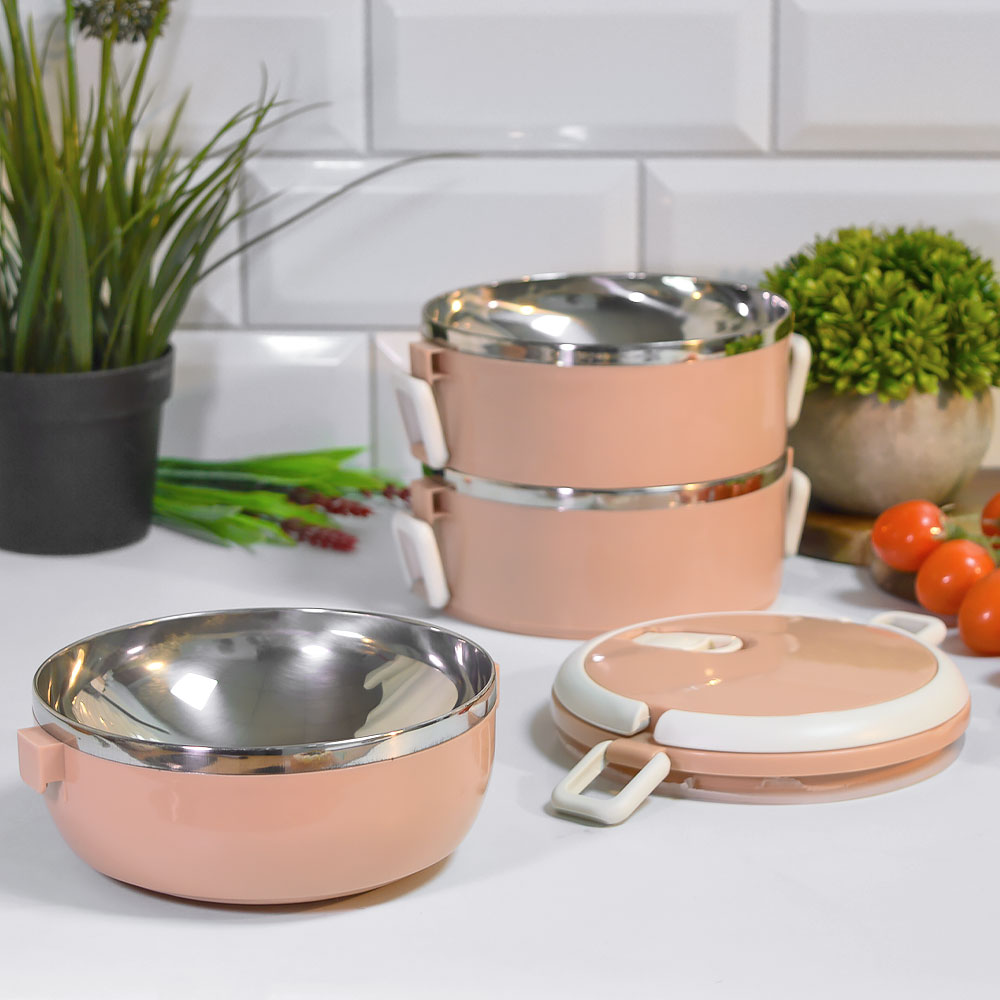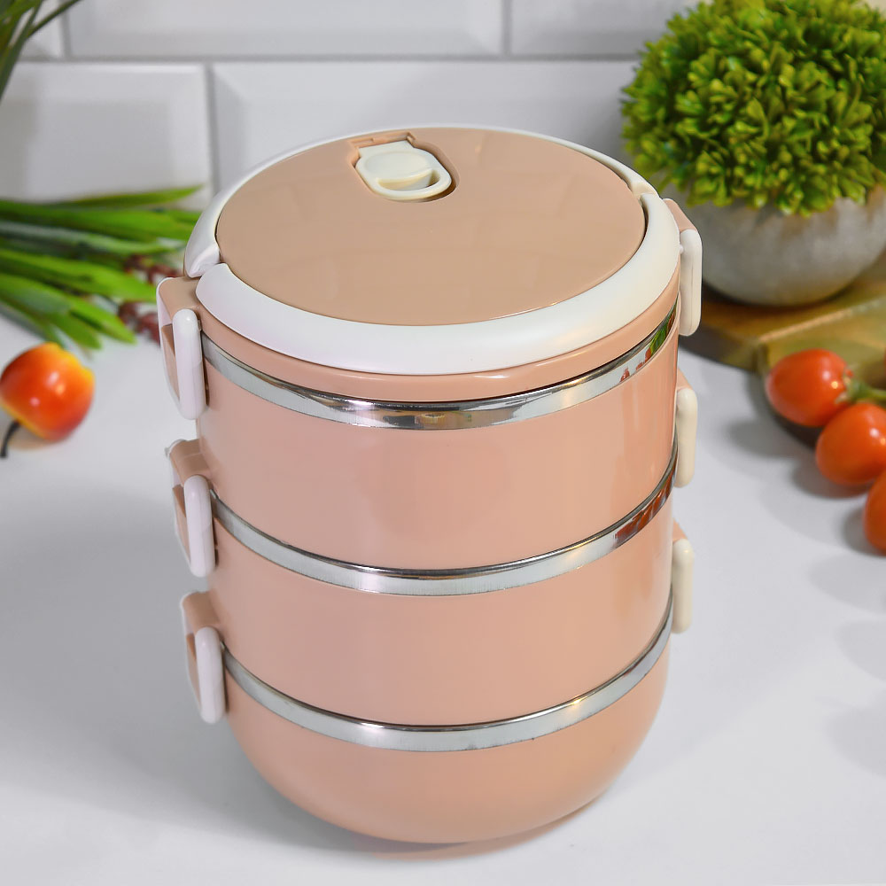 Трехъярусная конструкция позволяет удобно распределить продукты по отдельным секциям. Внутренние емкости выполнены из нержавеющей стали, что делает их устойчивыми к запахам и простыми в уходе. Герметичная крышка с надежными защелками плотно фиксируется и помогает избежать протеканий при переноске.