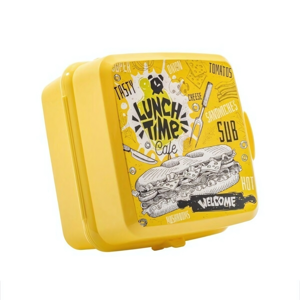 - Эмоциональная ценность: яркий желтый цвет и веселые рисунки сэндвичей, овощей и надписями вроде "Lunch Time!" делают использование ланч-бокса приятным опытом.