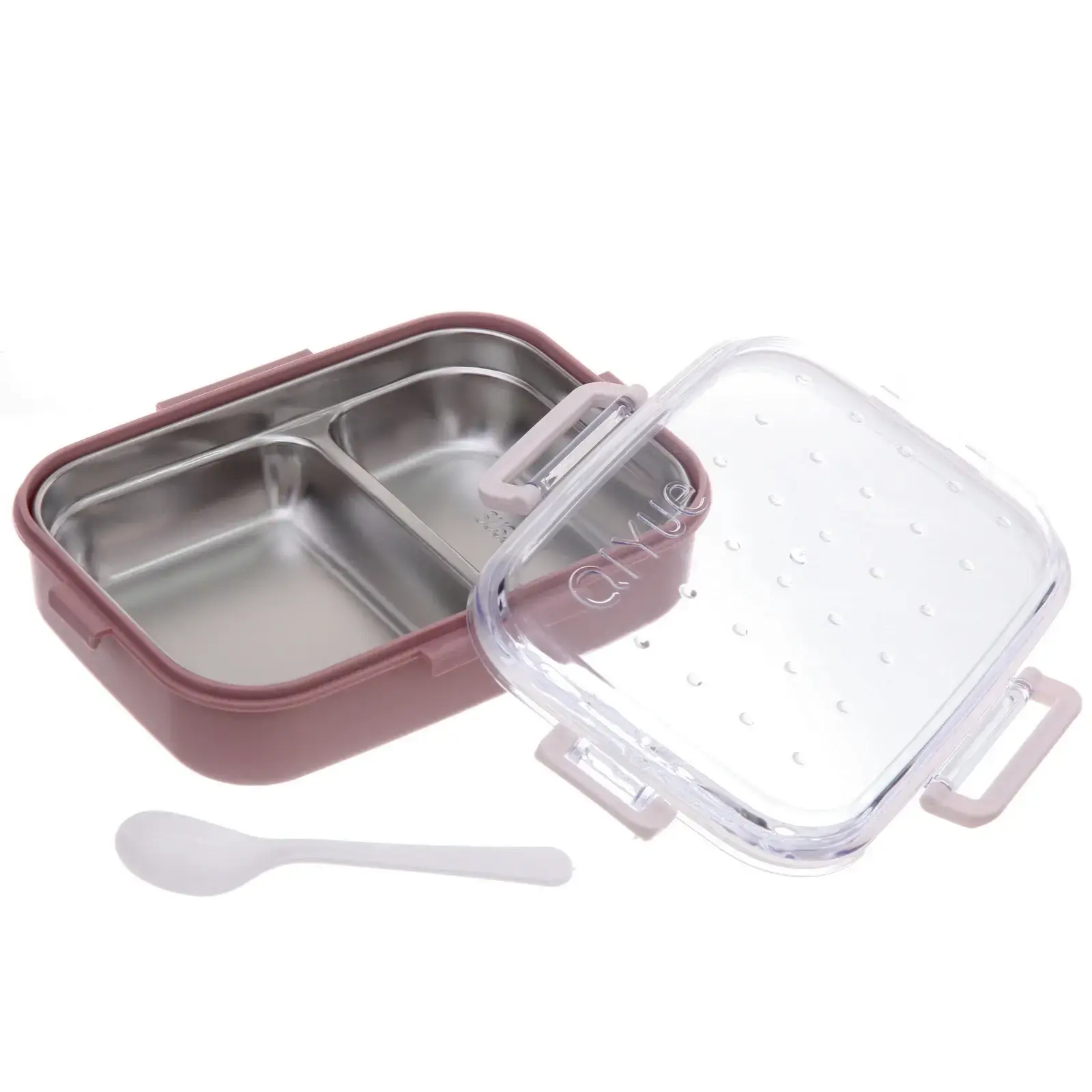 Ланч-бокс имеет прямоугольную форму и размеры 22х17х7 см, что делает его компактным и удобным для переноски. Прозрачная крышка с вентиляционными отверстиями позволяет контролировать содержимое и сохраняет свежесть продуктов. Надежные застёжки по бокам обеспечивают герметичность, что исключает протекание и смешивание блюд.