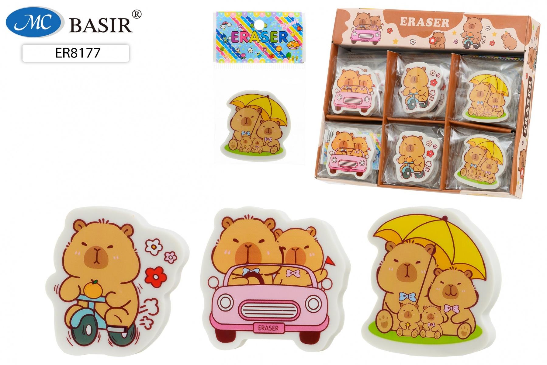 - Фигурный дизайн с милыми капибарами — три разных рисунка в ассортименте: капибара на самокате, капибары в розовой машине и семейство капибар под жёлтым зонтом. Каждый ластик — это маленькая история.