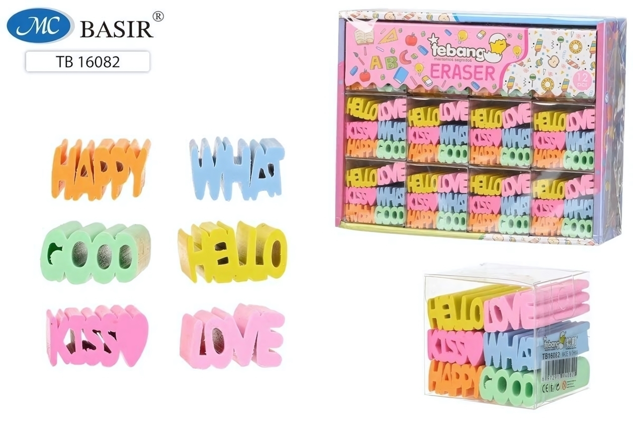 Ластики упакованы в прочный пластиковый блистер с прозрачной крышкой — их удобно хранить и брать с собой. Шесть разных слов («HAPPY», «LOVE» и другие) на английском языке помогут в изучении иностранных слов. Гладкая поверхность с рифленой текстурой предотвращает скольжение в руке.