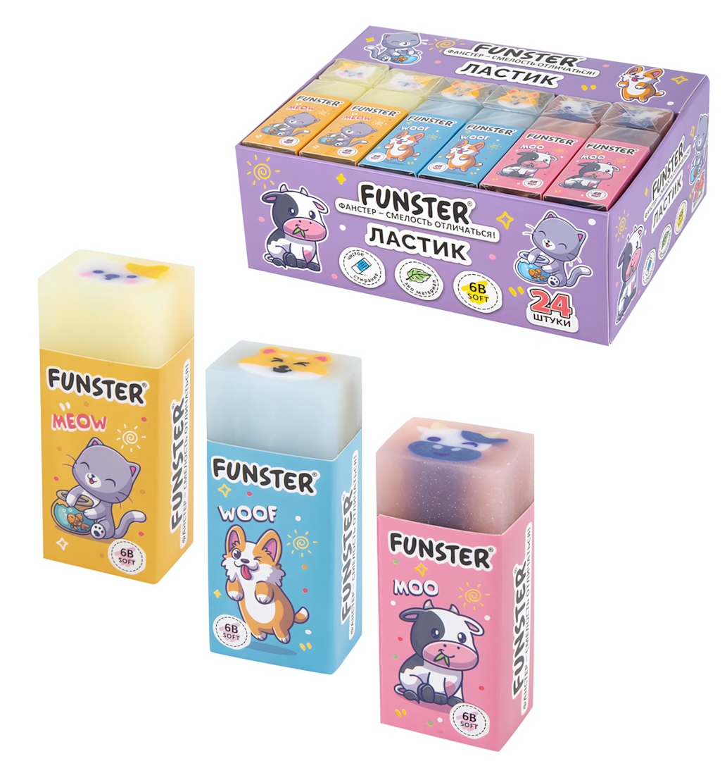 Ластик FUNSTER "Pets" — это сочетание функциональности и эстетики. Прямоугольная форма удобна для точных работ, а разноцветный принт с героями (собака, котенок или корова) поднимет настроение во время занятий. Ластик стирает мягко, плавно скользя по поверхности бумаги, что особенно важно для сохранения аккуратного вида школьных тетрадей и альбомов для рисования. Выбирайте надежного помощника для повседневных задач, который прослужит долго и сохранит свои свойства до полного истирания.