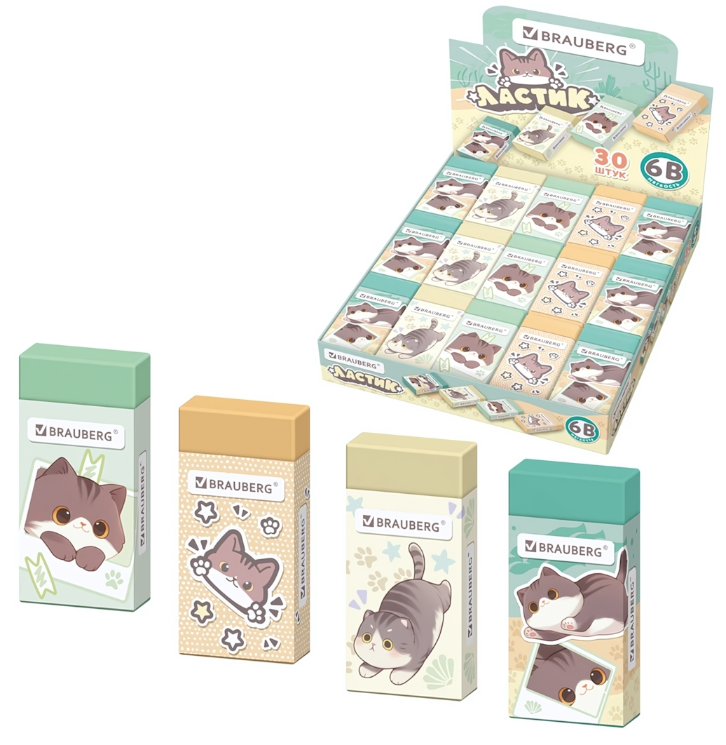 Размер: 50х24х10 мм. Форма: прямоугольная с закругленными краями. Материал: экологичный ПВХ. Упаковка: картонный дисплей с изображениями котов. Количество: один товар, цвет определяется случайным образом, в ассортименте. Страна производства: Китай. Обеспечивает оптимальное соотношение цены и качества для школьных и домашних задач.