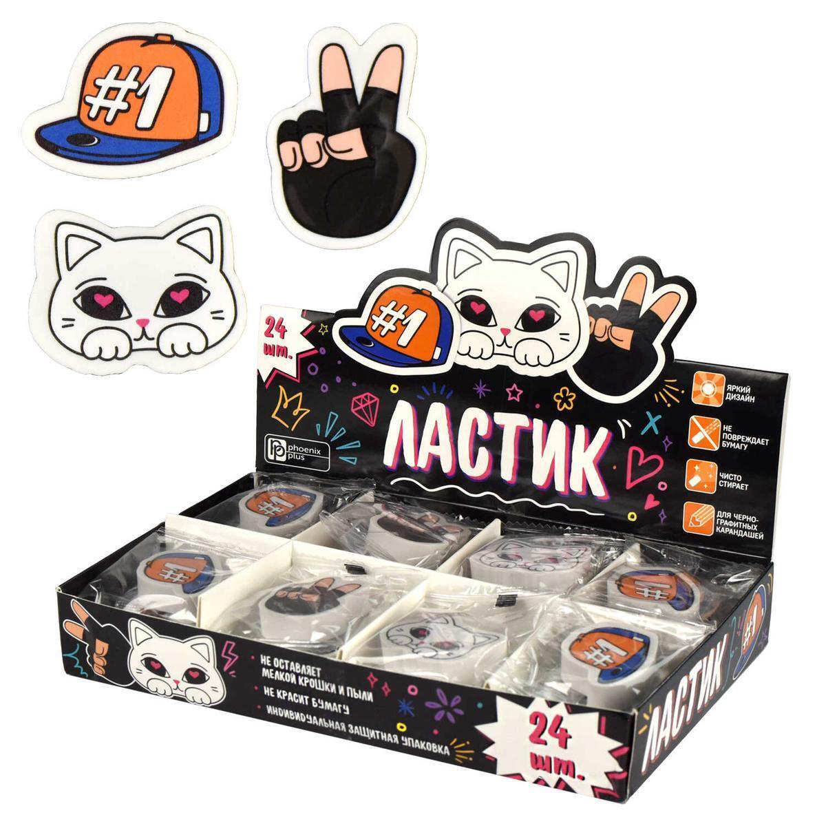 Ластики канцелярские «Кот», 24 шт., ассорти, термопластичная резина, 40х31х10 мм, безопасное стирание