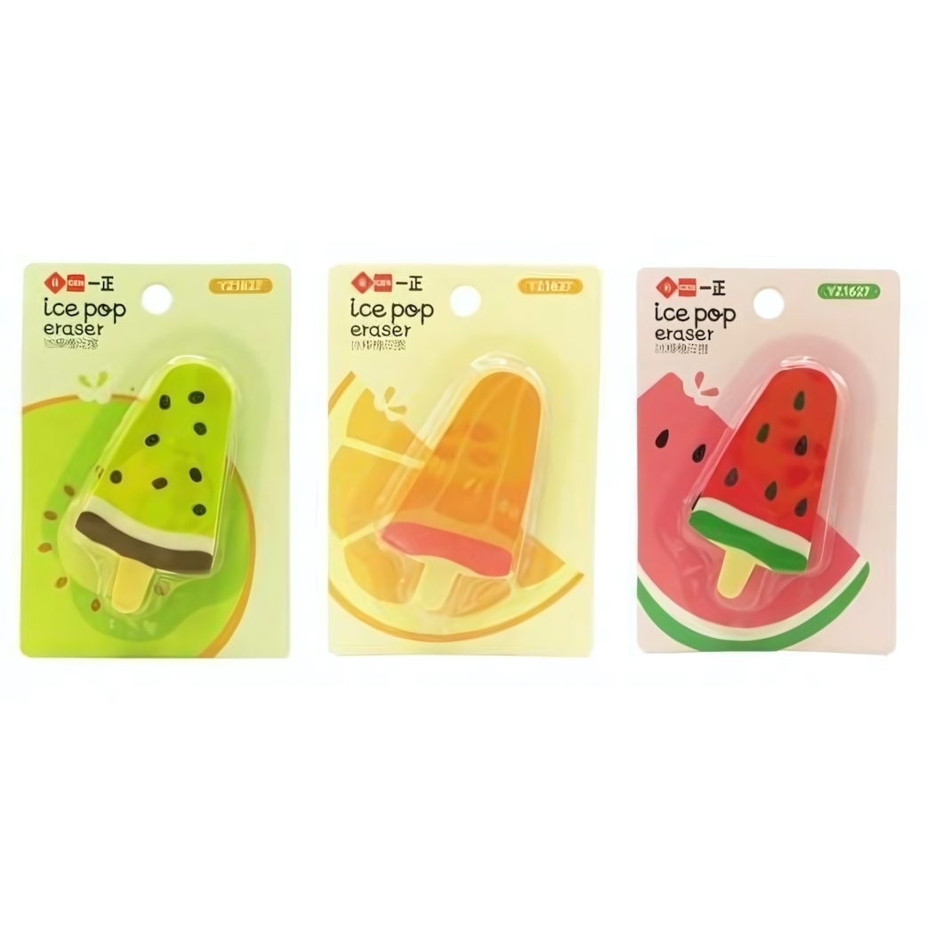 Ластик представлен в нескольких цветах, включая зеленый с черными точками, оранжевый и красный с зелеными и черными элементами. Упаковка имеет форму, которая способствует визуализации ластиков как мороженого на палочке, что делает его не только функциональным, но и стильным аксессуаром для вашего канцелярского набора.