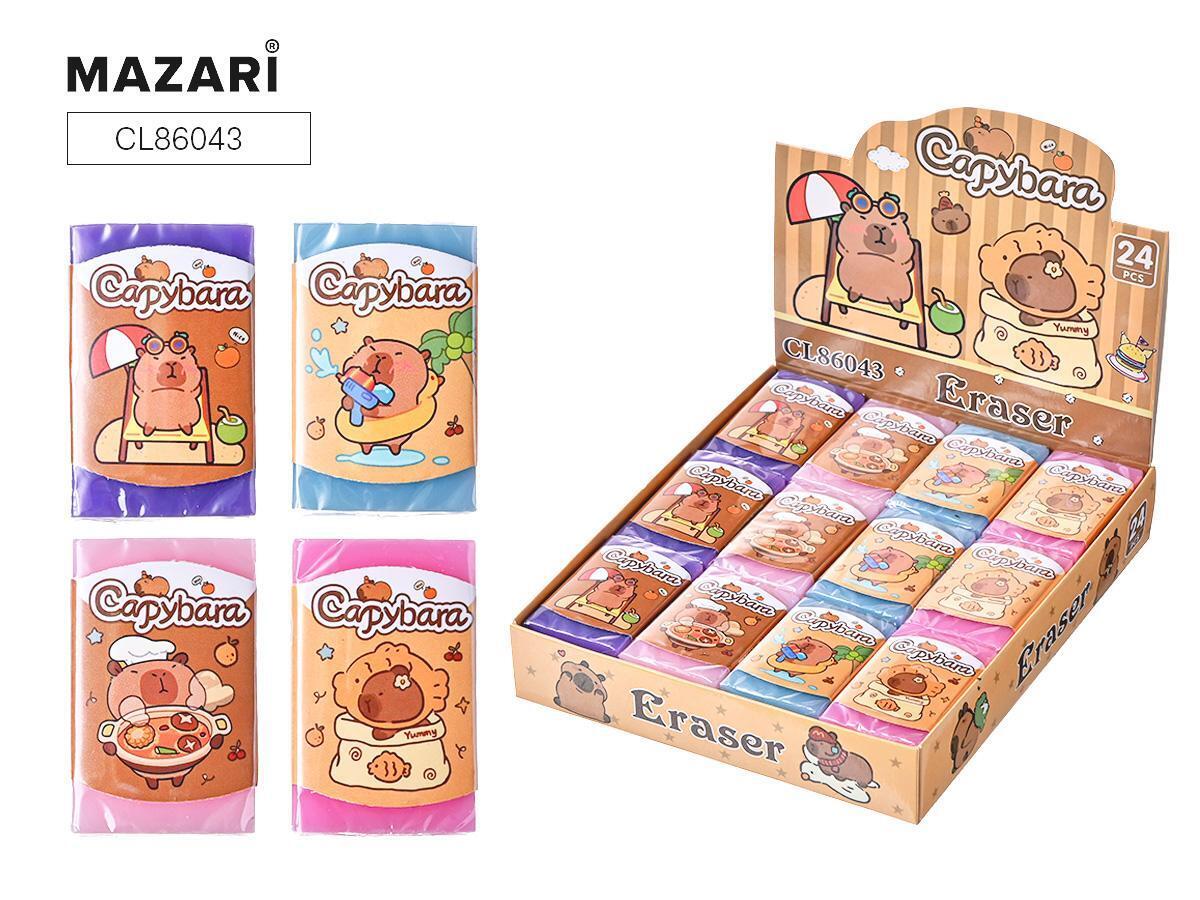В ассортименте представлены четыре различных дизайна с изображением очаровательных капибар в различных ситуациях: с очками, с игрушками и другими аксессуарами. Каждый ластик поставляется в индивидуальной ОПП-упаковке, защищающей изделие от загрязнений.