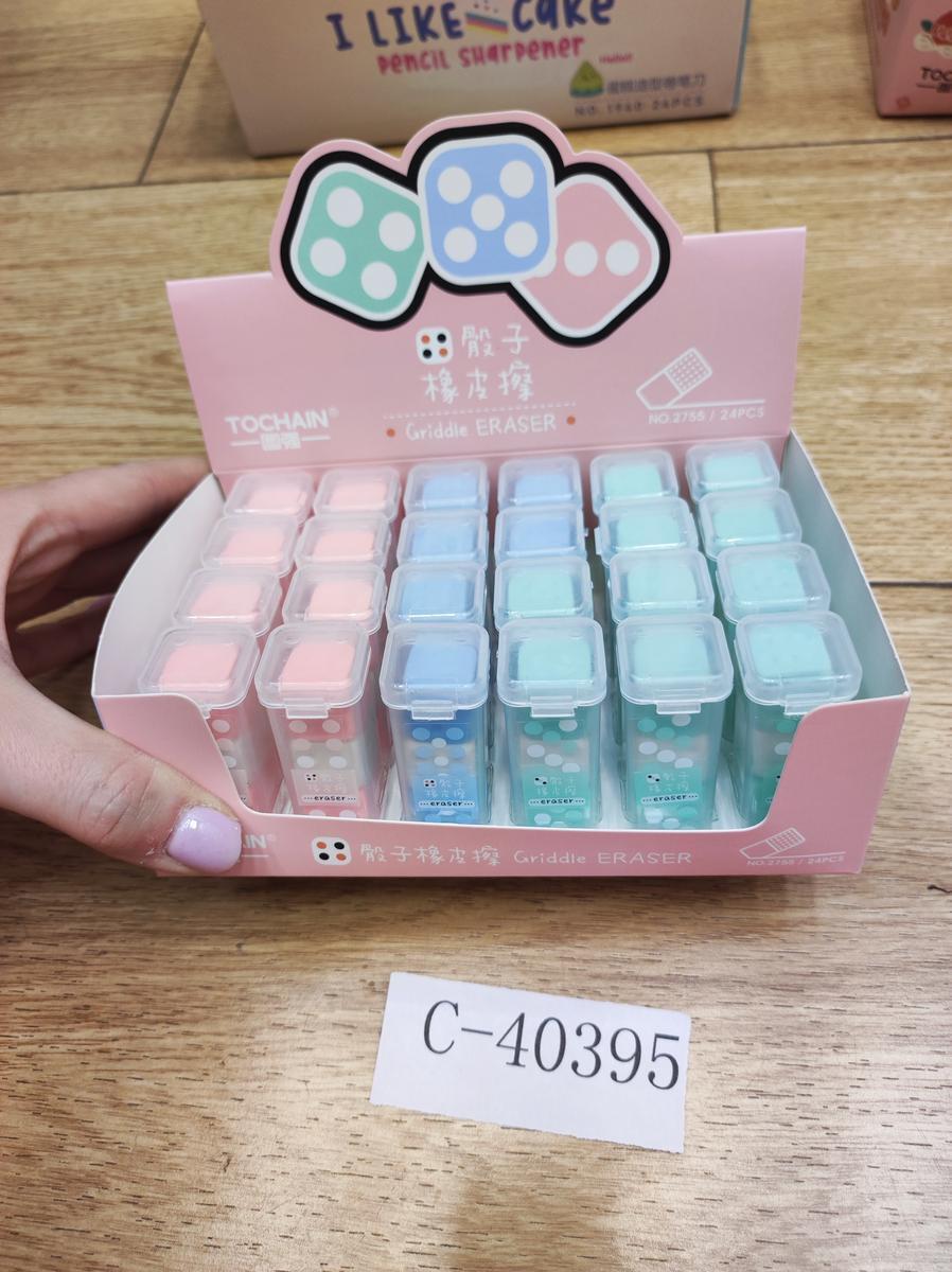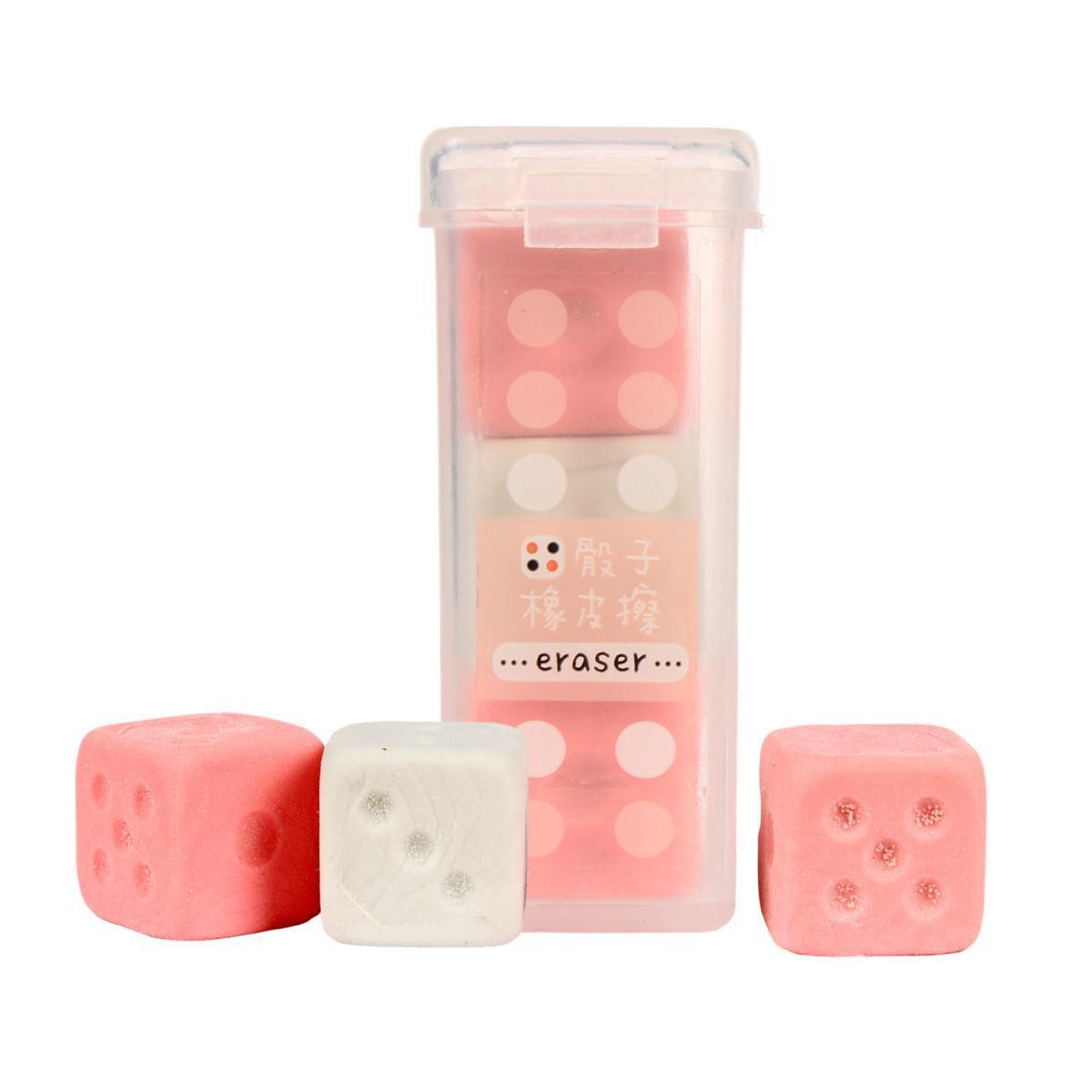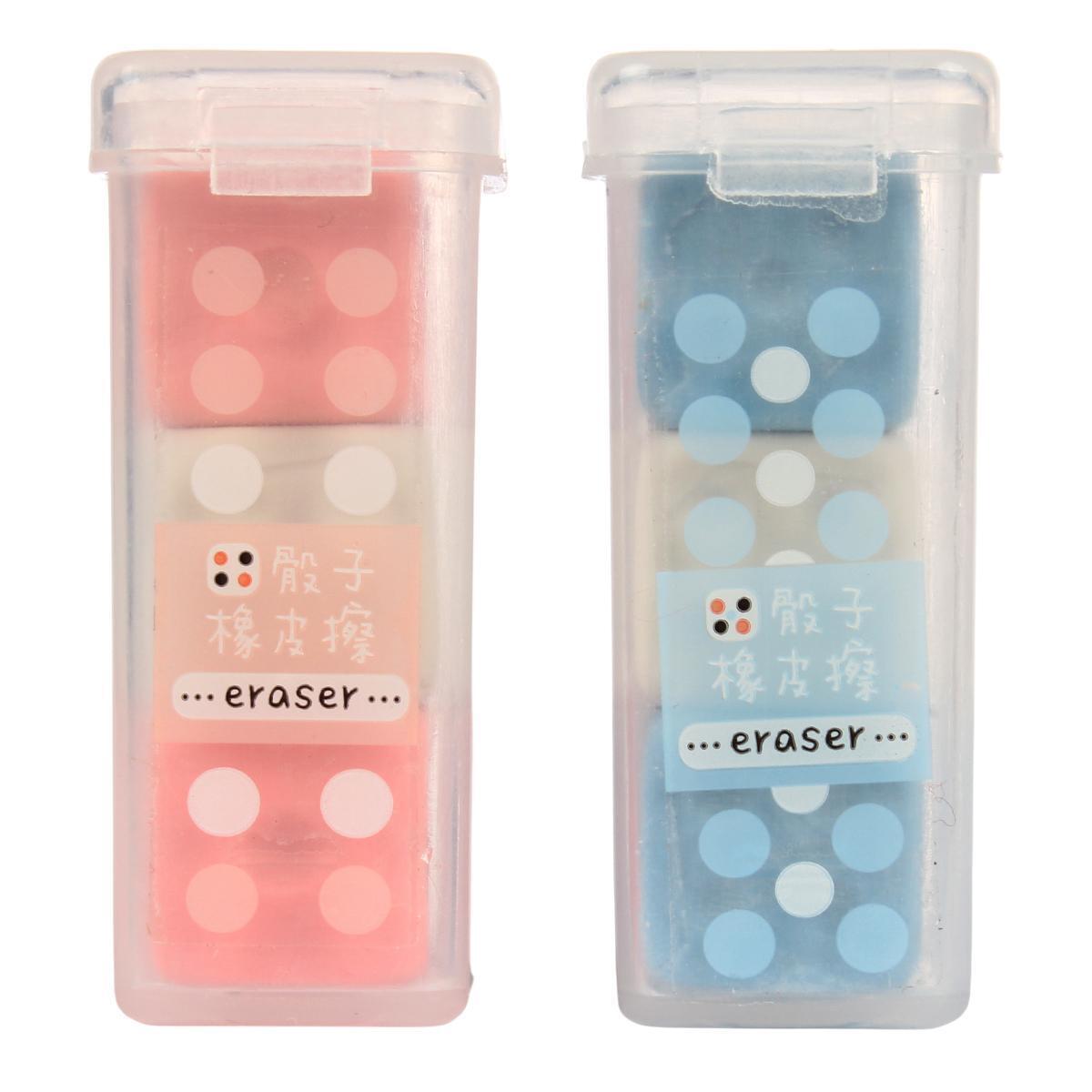 Поставляется в прозрачном пластиковом футляре, внутри которого удобно хранить и перевозить до 3 ластиков приятных пастельных оттенков: розового, голубого и белого, каждый из которых обладает оригинальной формой кубиков с точками в виде граней игральных костей и гладкими поверхностями.