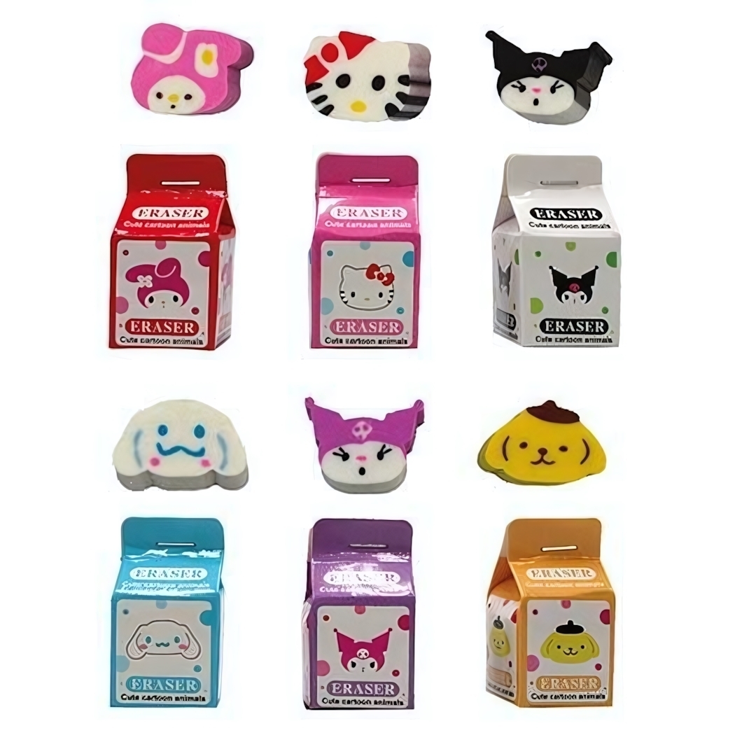 Каждый ластик упакован в фирменную картонную коробочку, стилизованную под миниатюрный пакет, где изображён соответствующий персонаж. Цвета и оформление создают позитивное настроение и делают процесс учёбы или работы чуть более приятным.