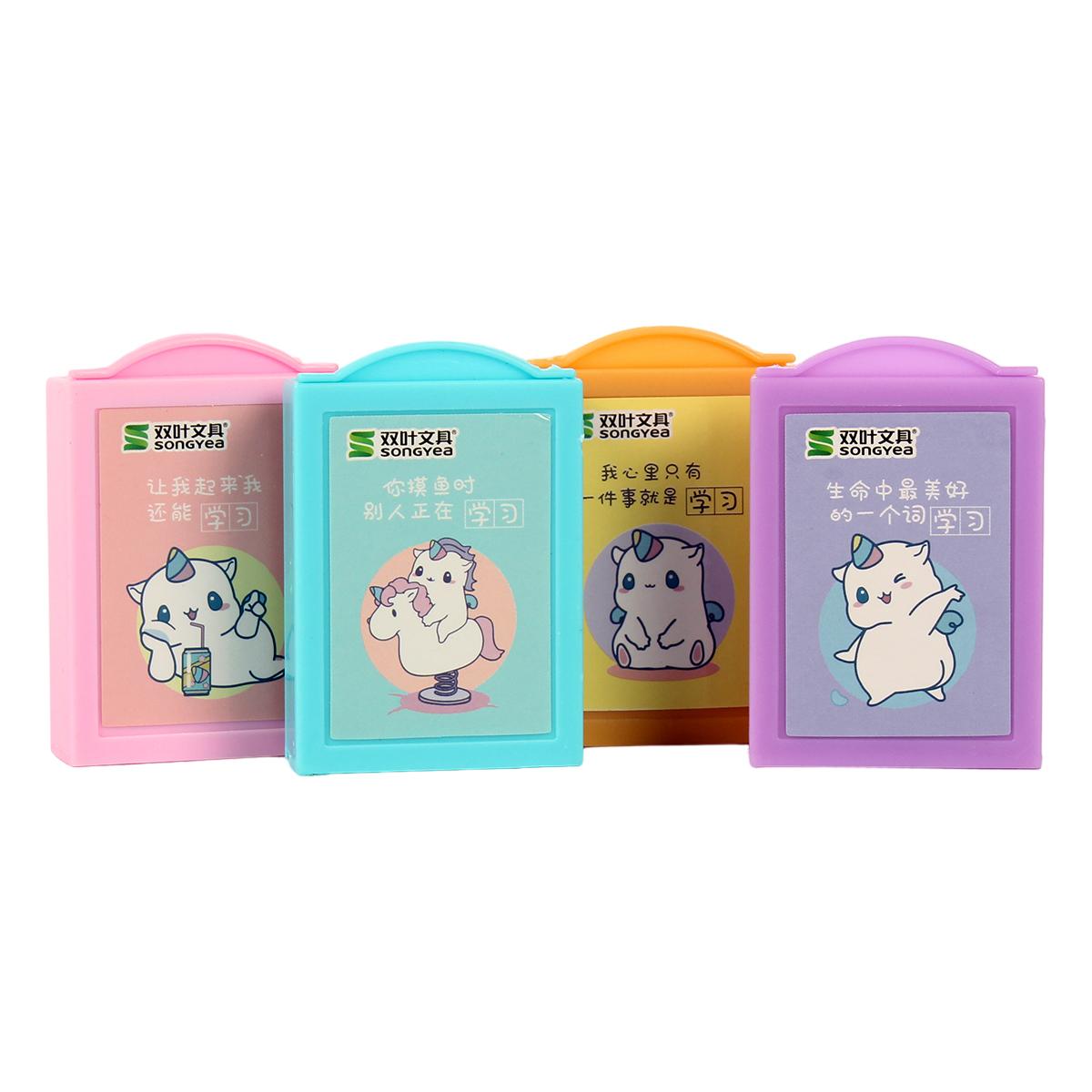 Специальная конструкция корпуса предотвращает полную выемку ластика — теперь он всегда будет под рукой. Гладкие закругленные углы футляра делают использование безопасным даже для малышей. Набор из 4 разных дизайнов позволяет менять ластики в зависимости от настроения или коллекционировать их.