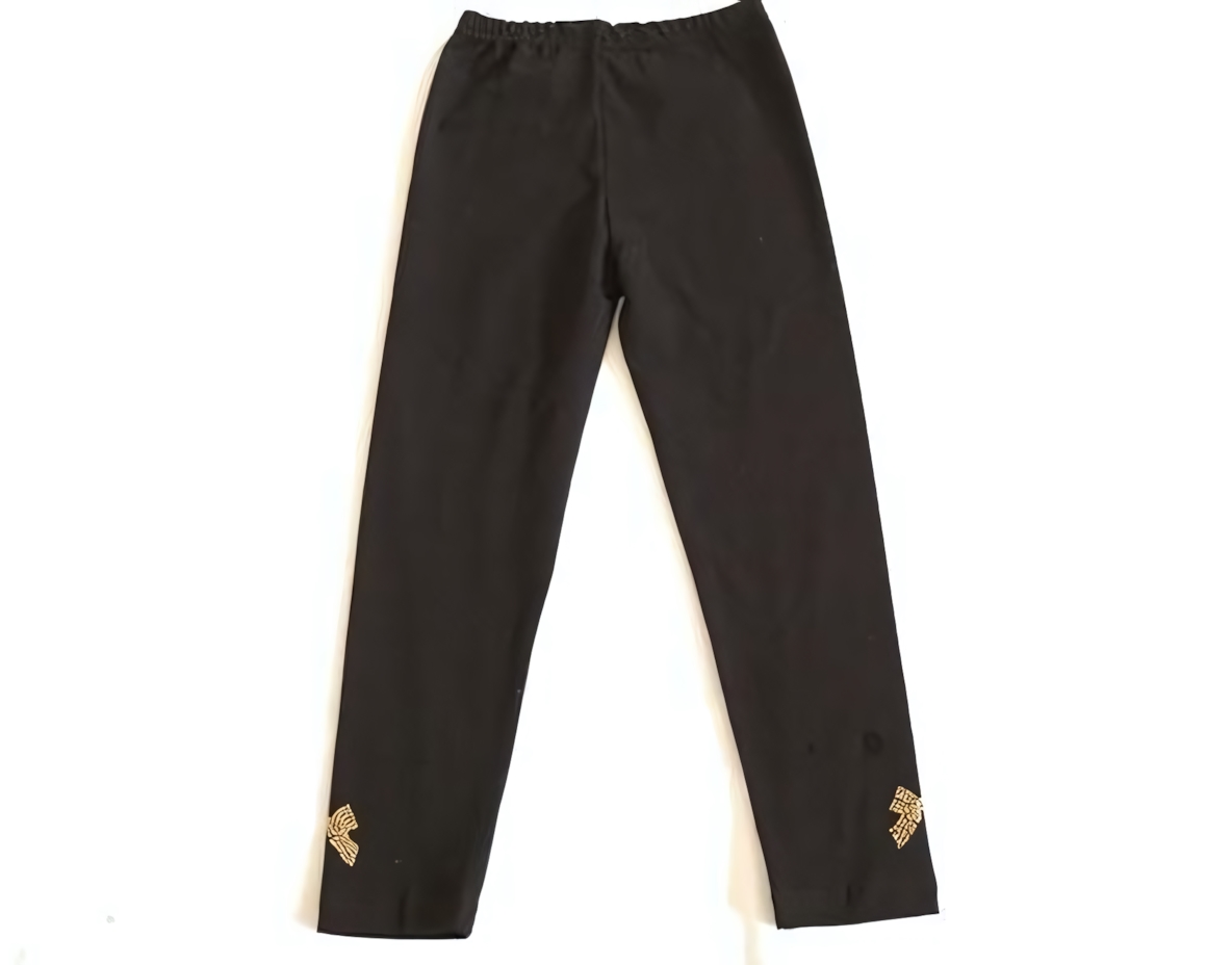 Эти стильные и удобные леггинсы обеспечат комфорт и свободу движений вашему ребенку. Они отлично подойдут как для повседневных прогулок, так и для активных игр, благодаря эластичному материалу, который не стесняет движения. Черный цвет и декоративные элементы в виде золотых бантиков добавят изюминку в стиль любой юной модницы.