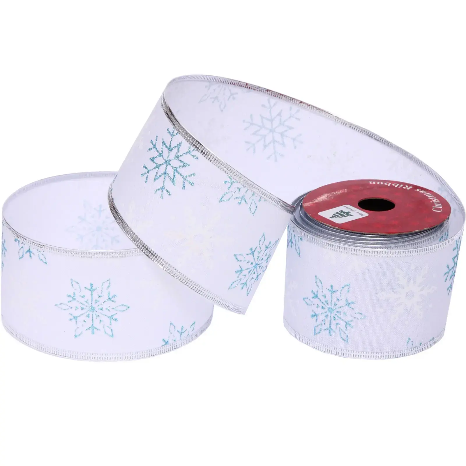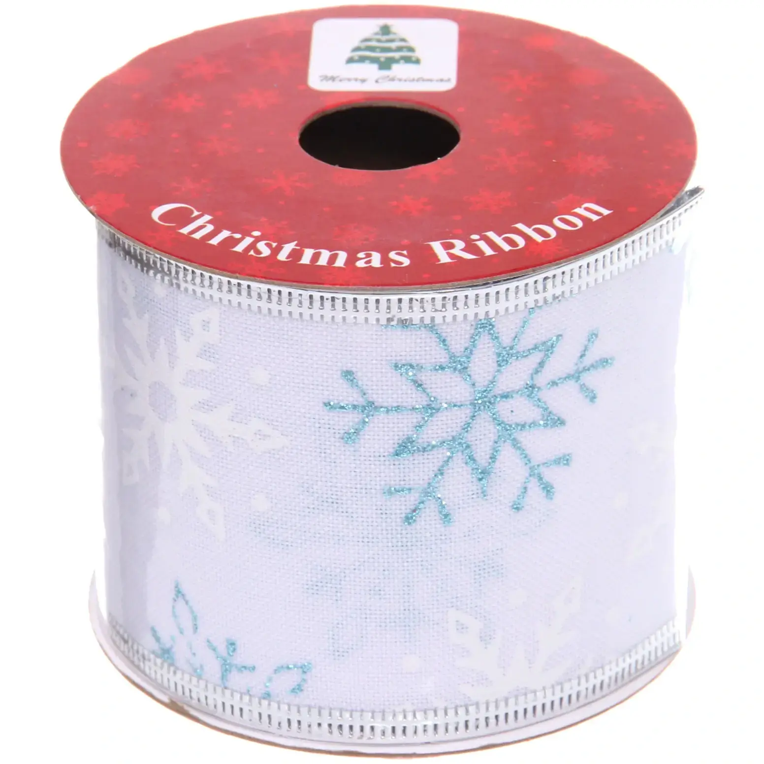 Лента декоративная «Снегопад» 6,3 см х 2,7 м, полиэстр, белая с голубыми снежинками, серебристая окантовка