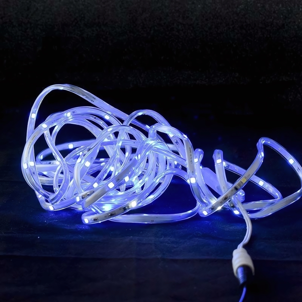 Материал корпуса — прозрачный или полупрозрачный пластик, излучающие синий свет светодиоды. Гибкая полоса легко сворачивается и изгибается без повреждений, что делает ее универсальной для различных идей оформления. Идеальна для создания световых фигур, украшения окон, стен или использования в витринах.