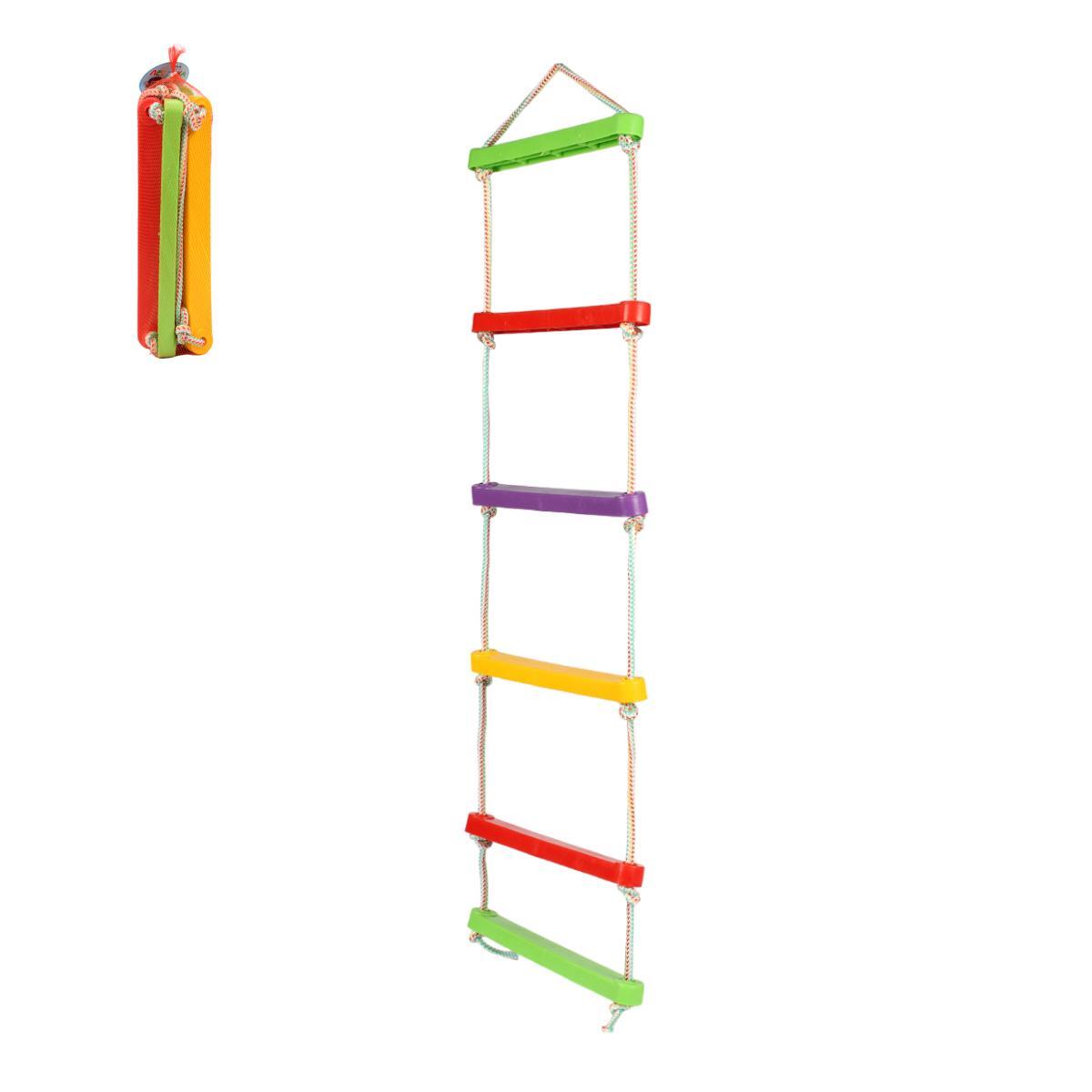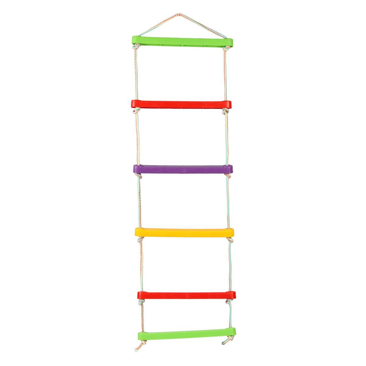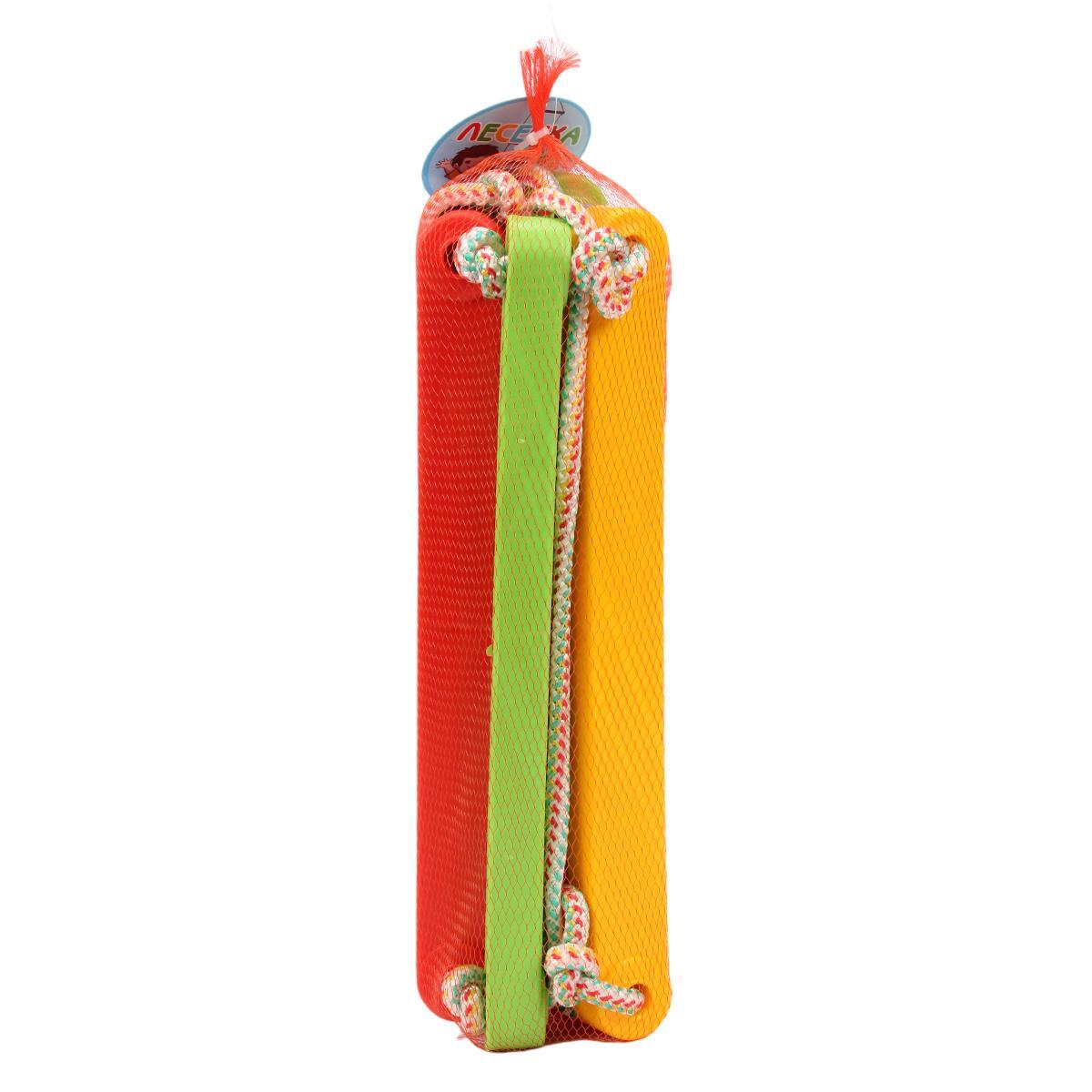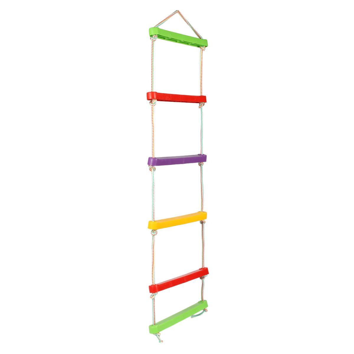 Лестенка состоит из пяти ступеней, каждая из которых имеет прямоугольную форму. Ступени окрашены в зеленый, красный, фиолетовый, желтый и снова красный цвета, что создает яркий и привлекательный вид. Конструкция лестенки позволяет легко крепить её к различным опорам, а также обеспечивает стабильность во время использования. Размеры и материалы лестенки делают её идеальной для детей, которые любят активные игры и физическую активность.