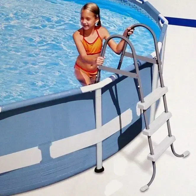 Лестница подходит как для каркасных, так и для надувных бассейнов с высотой борта до 91 см. Она легко устанавливается и имеет широкий угол между сторонами, что предотвращает касание стенок бассейна. Это делает ее удобной в использовании, особенно для детей и пожилых людей.